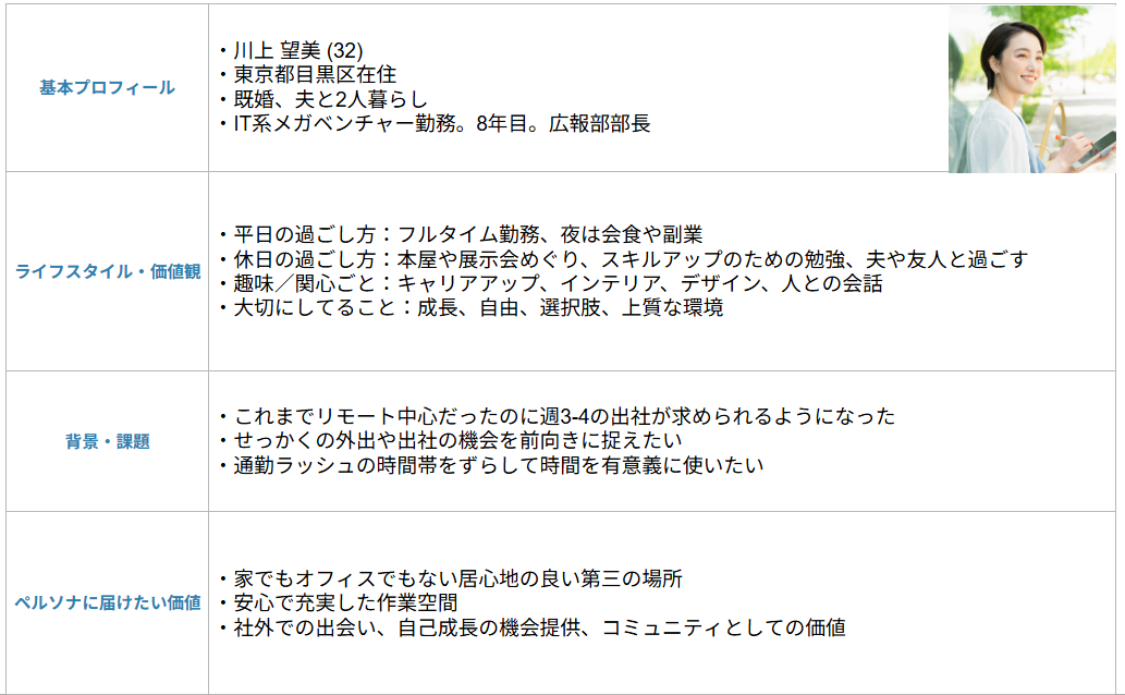 ペルソナが大切にしていることとして、「成長」「自由」「上質な空間」などが挙げられていたことから、上記なようなキーワードを設定しました。