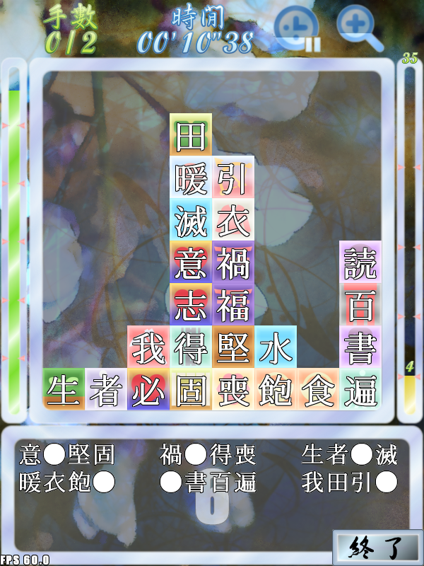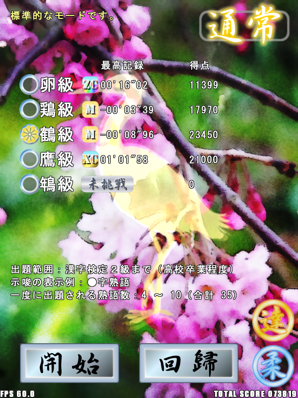 四字熟語を題材にしたパズルゲームです。小学校卒業程度の漢字能力から楽しめます。また、漢字に詳しい人でも苦戦するほどの難関や、さまざまなやり込み要素が用意されています。日本漢字能力検定(漢検)5級~1級に準拠しているので、漢検の学習にも役立ちます。