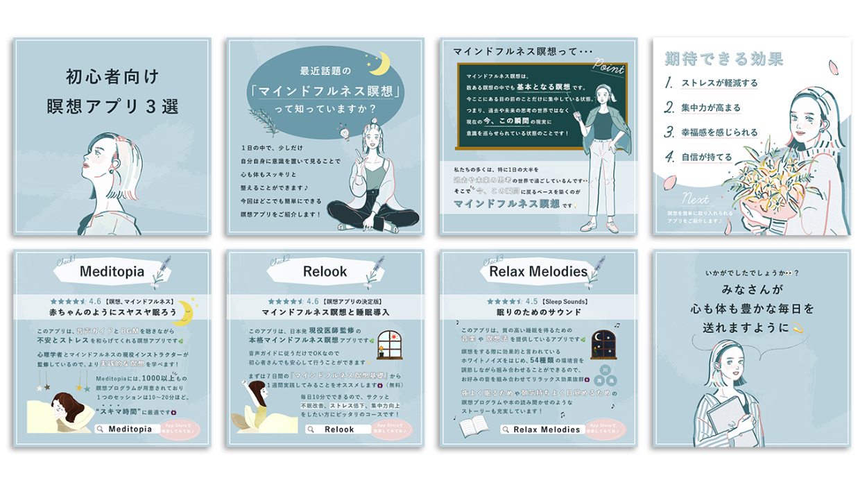 Instagram @she_officials のインスタグラムバナーを制作しました。最近話題の『マインドフルネス瞑想』を実践し、初心者でも簡単に取り組めるアプリの紹介を分かりやすくまとめました。