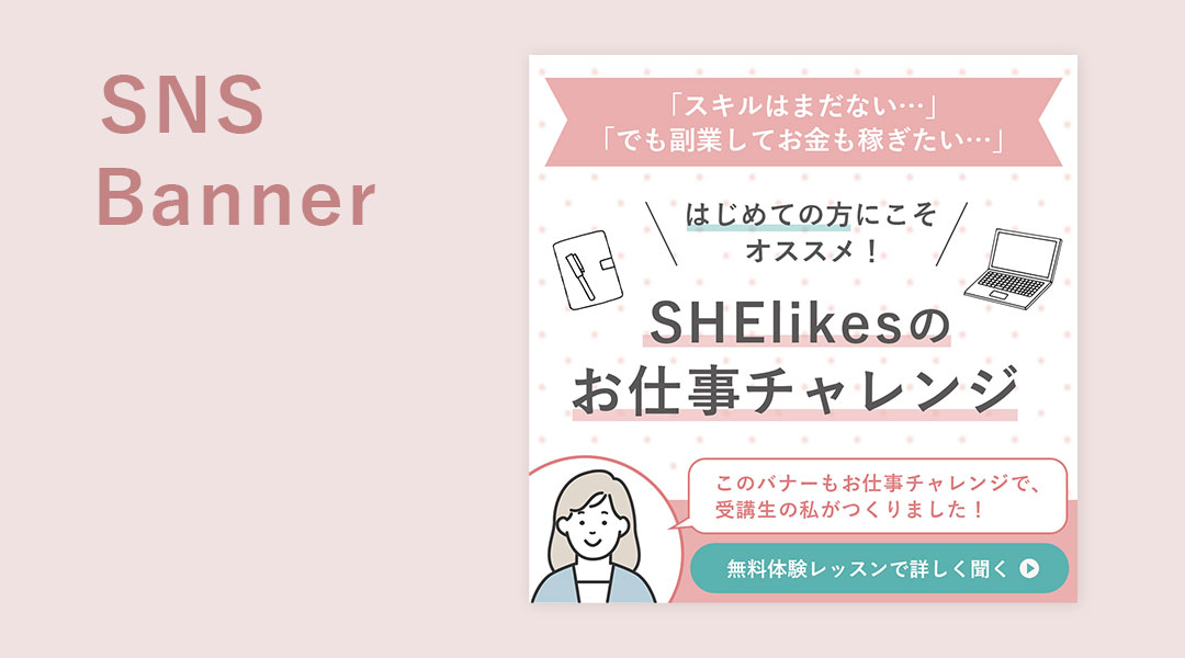 SHE株式会社様の運営するキャリアスクール「SHElikes」のLINE配信用バナーを制作し、コンペ形式で採用していただきました。