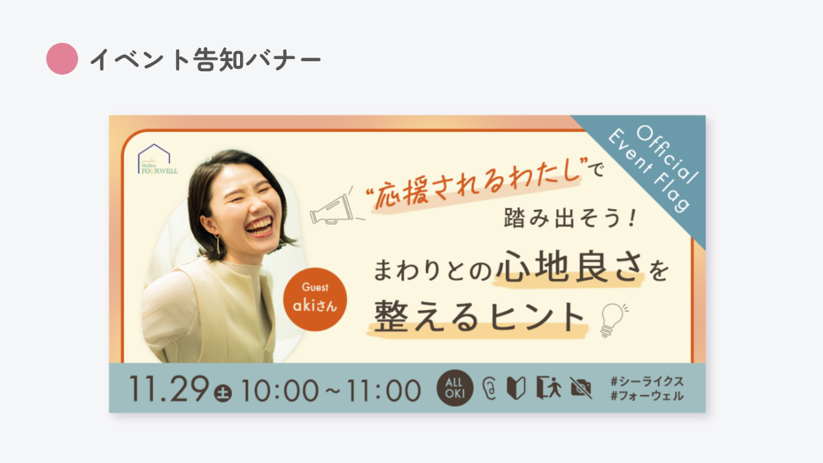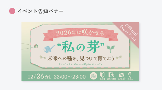 ●実案件|キャリアスクールSHElikes内のコミュニティイベントの告知バナーを制作しました。[ 制作年:2025年11月 制作期間:5時間 使用ツール:Photoshop]
