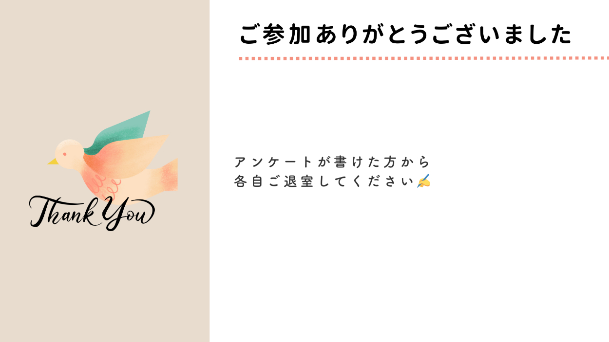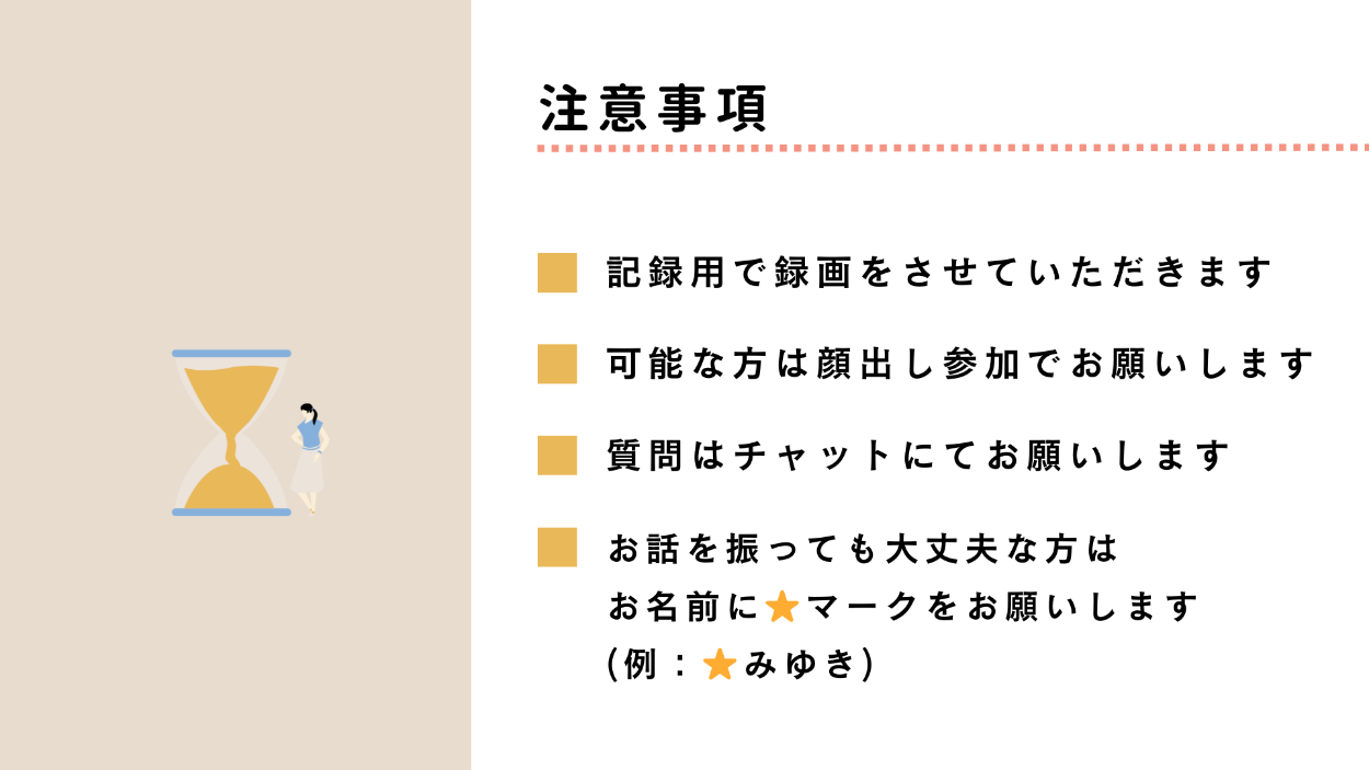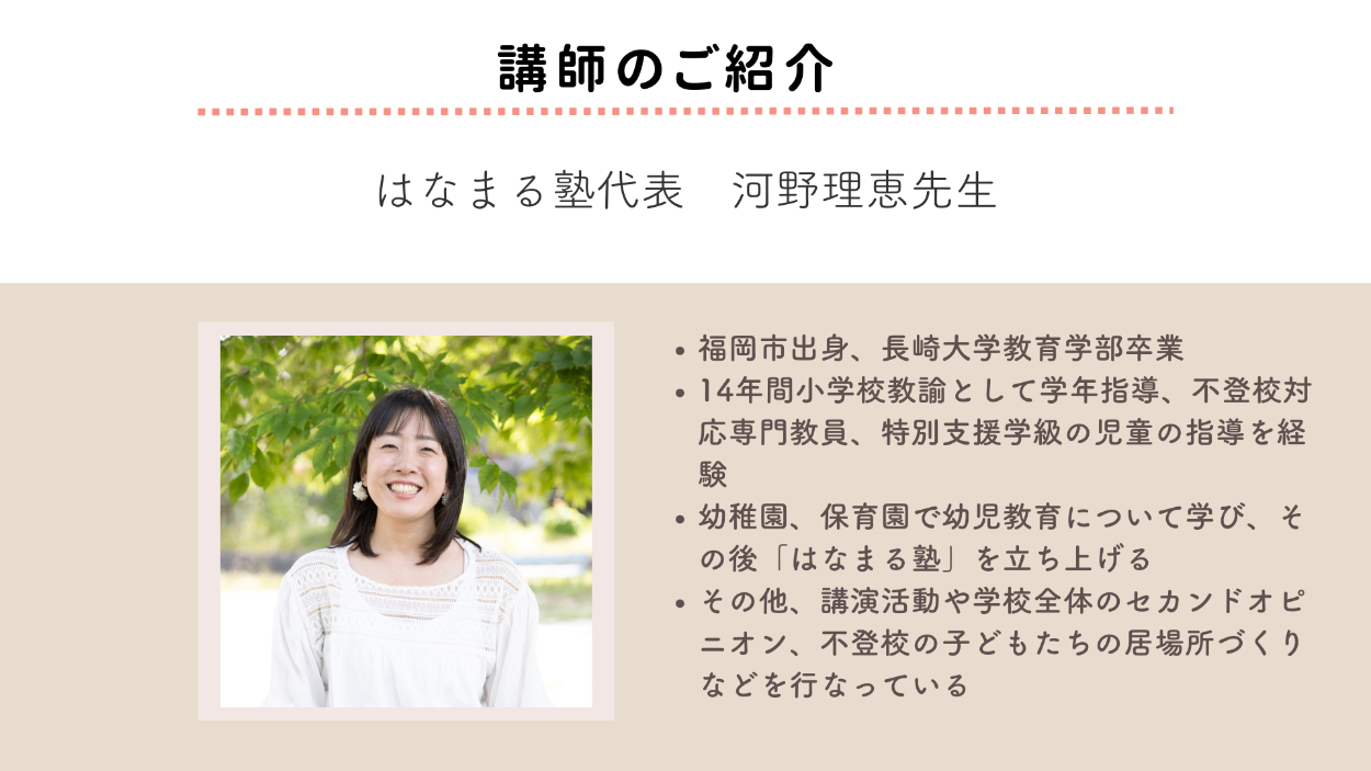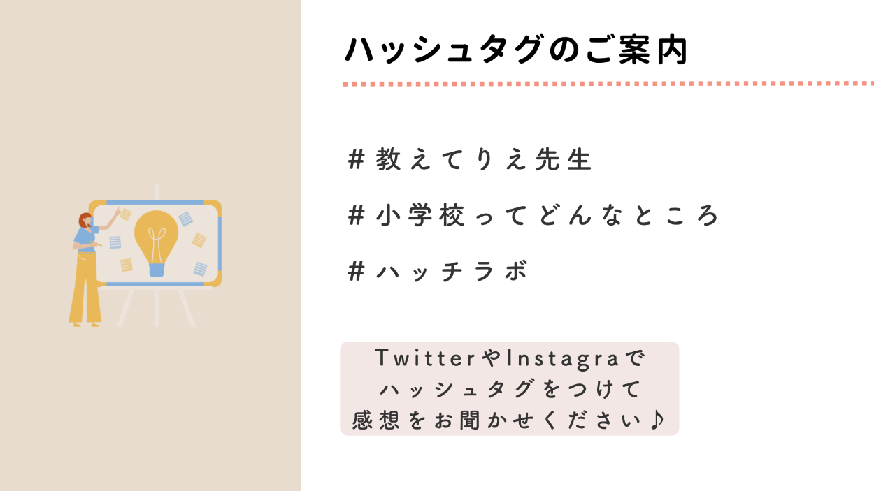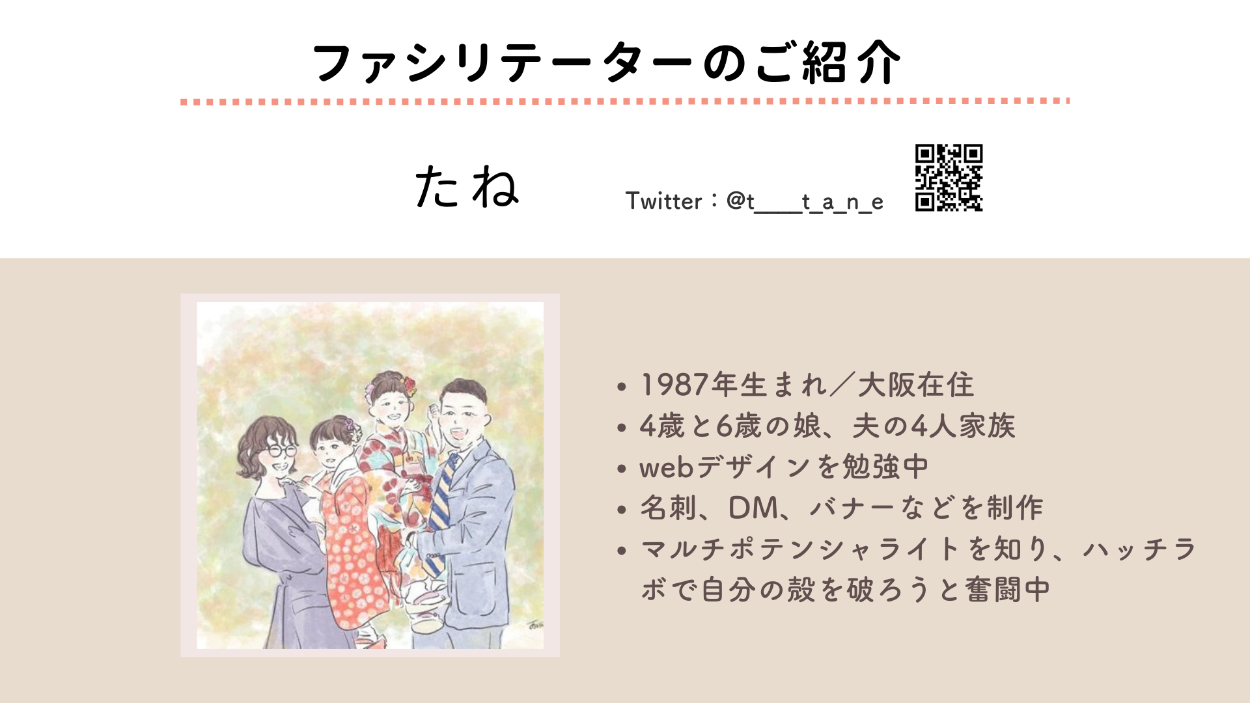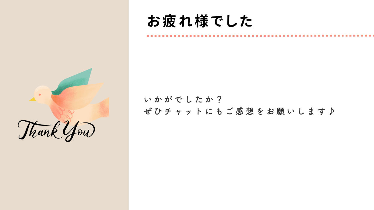 【実案件】スライド制作 tane.T マルチデザイナー OVERVIEW 元小学校の先生によるオンライン講演で流すスライドを制作しました 【制作】元小学校の先生によるオンライン講演という一見お堅いイメージを、親やすく柔らかい印象を持ってもらいたいとの想いがお伺いして、下記を選定しましたベージュ:落ち着いたイメージオレンジ:明るく親しみやすい丸ゴシックフォント:優しい雰囲気