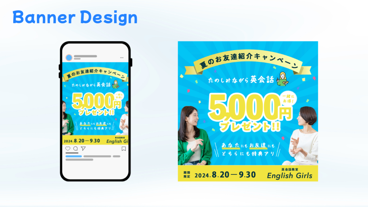 SHElikes PROデザイナーでの実践課題です。 英会話教室からの依頼を想定したバナーを制作しました。