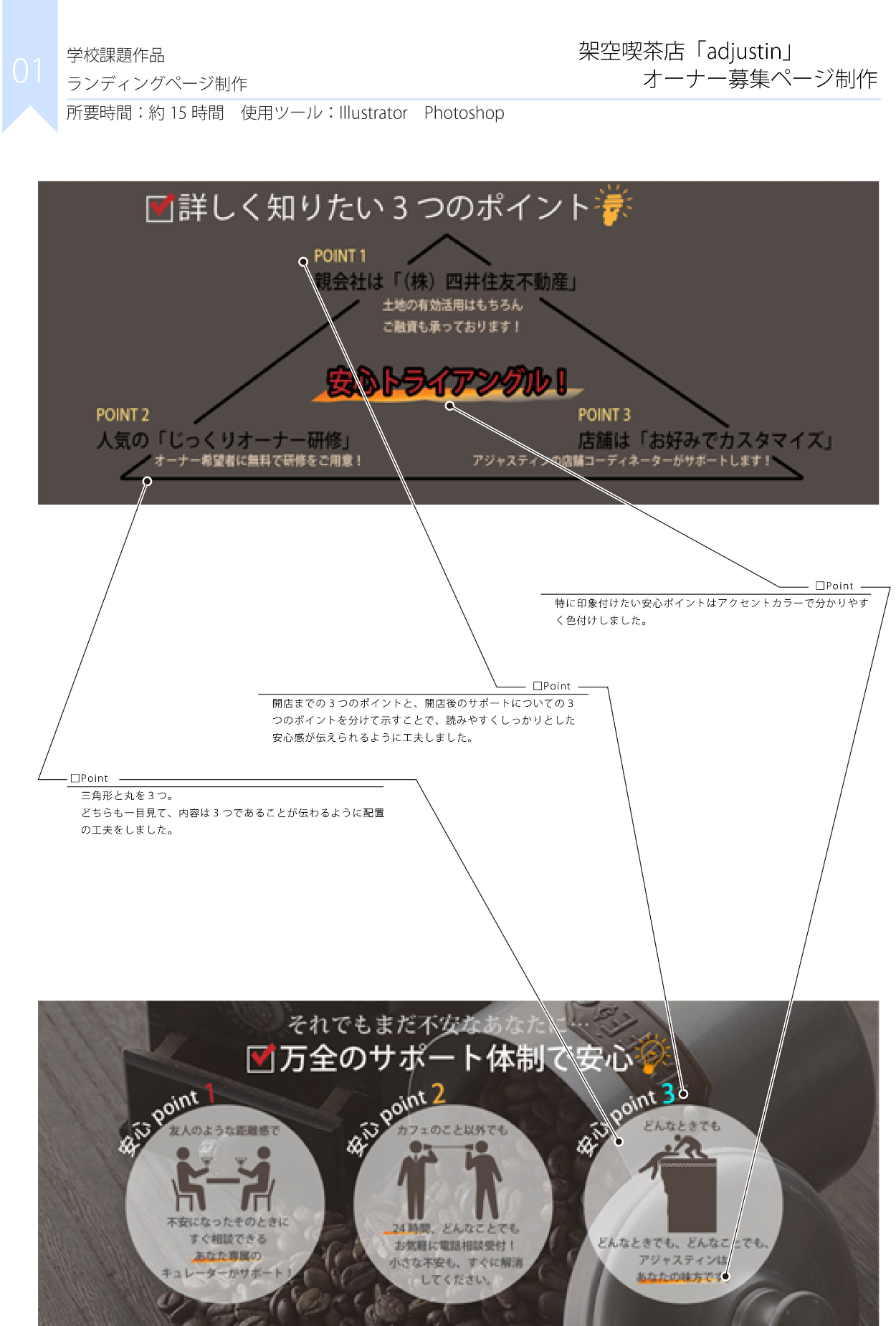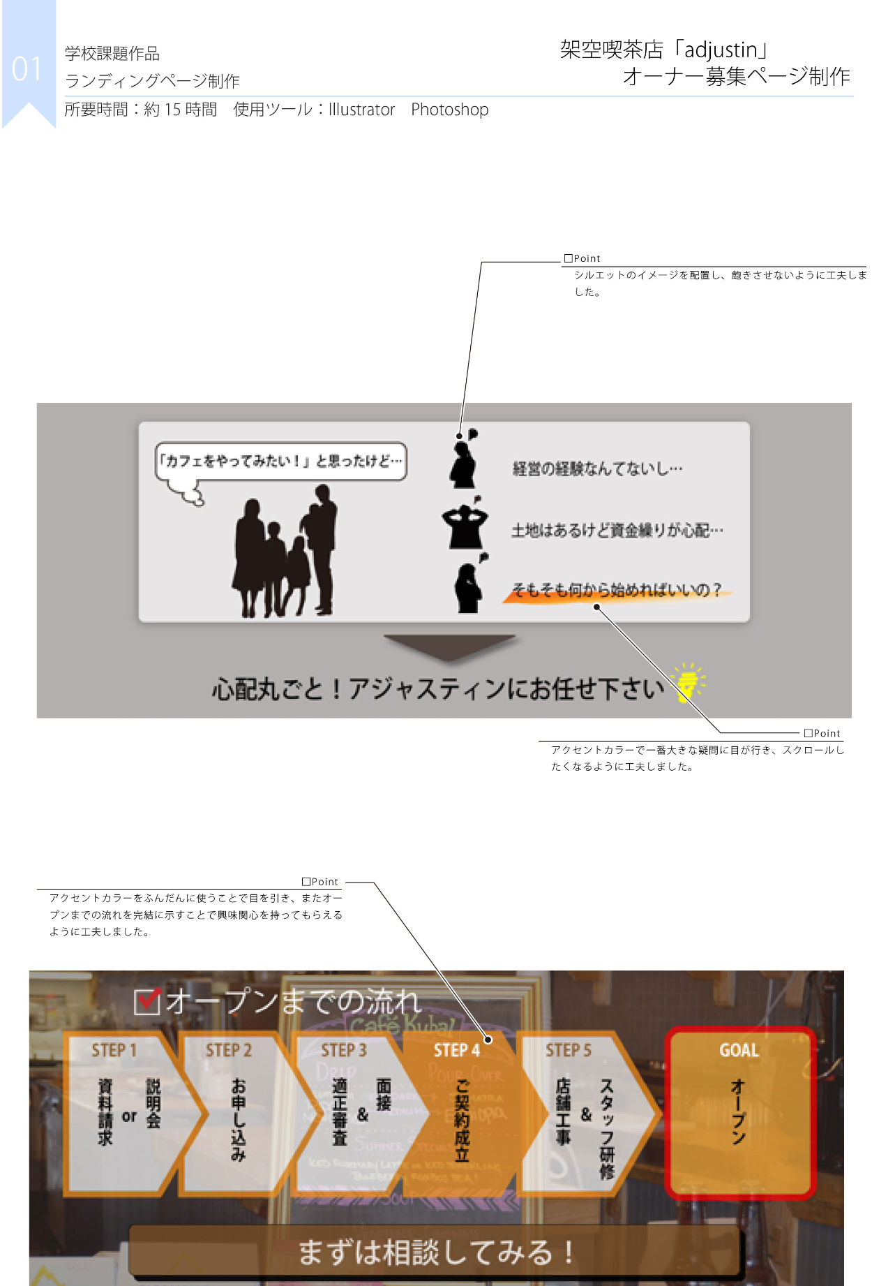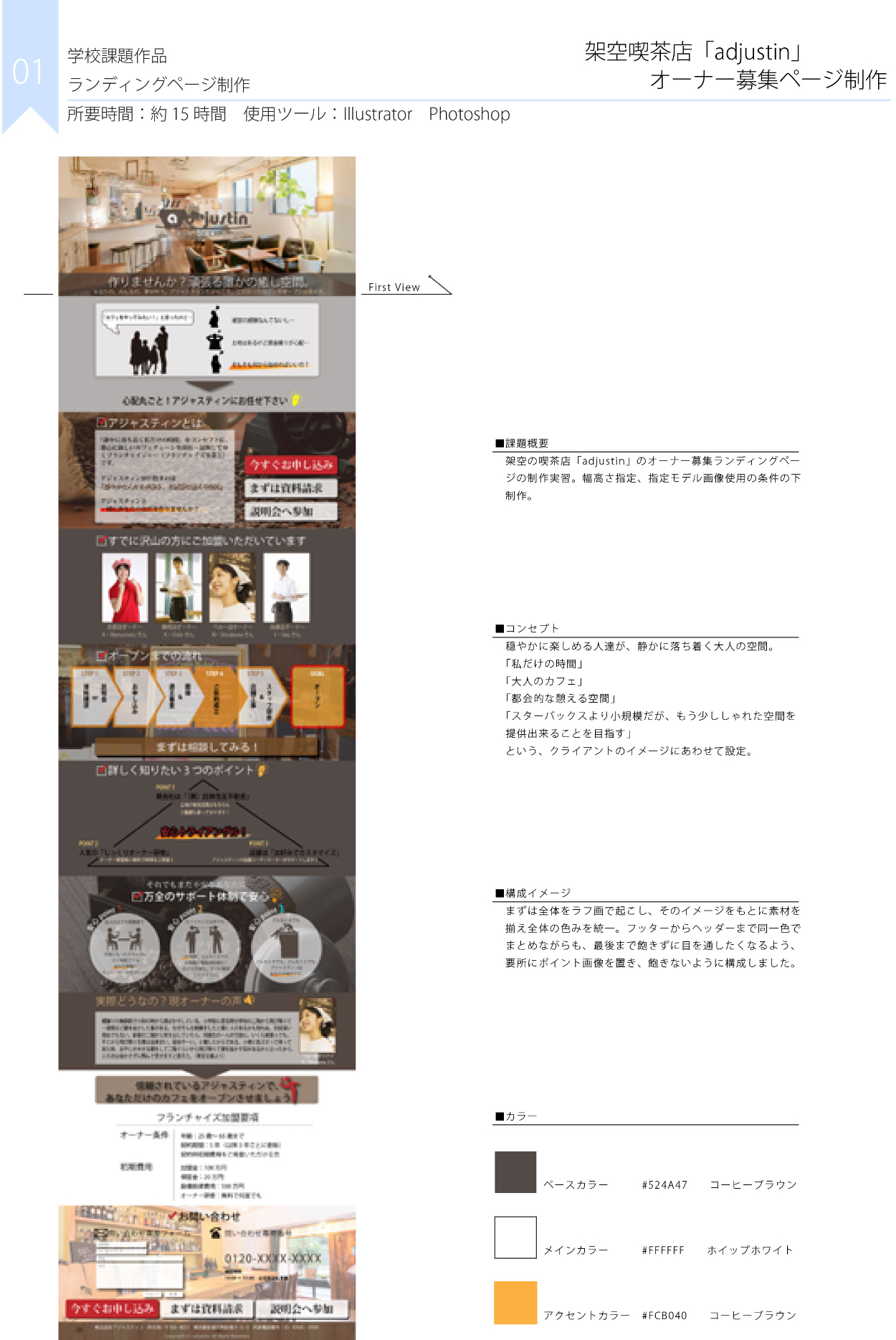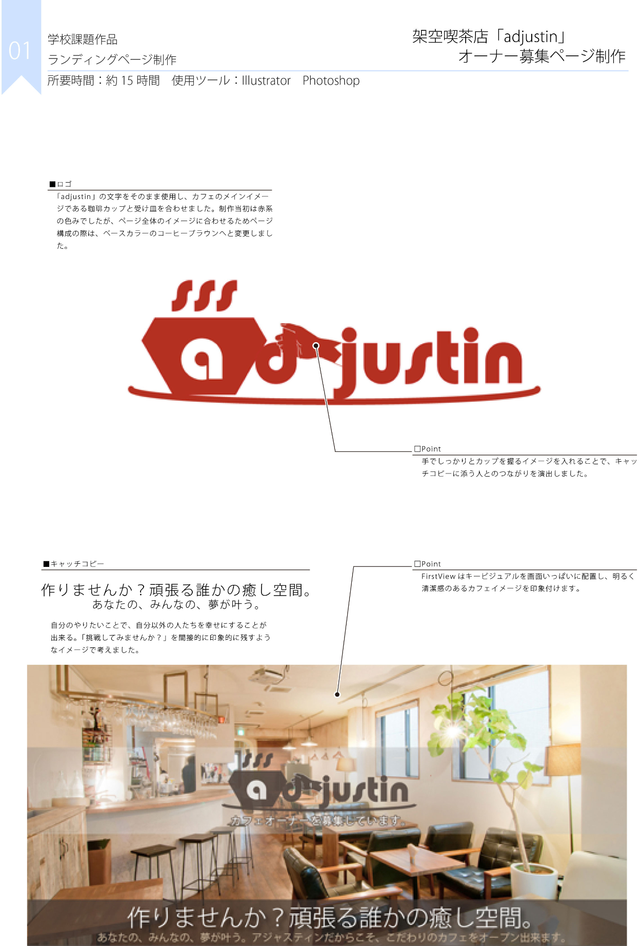 架空喫茶店「adjustin」オーナー募集ページ つんこ ものつくりが好きな人 OVERVIEW 架空の喫茶店「adjustin」のオーナー募集ランディングページの制作実習。幅高さ指定、指定モデル画像使用の下制作。