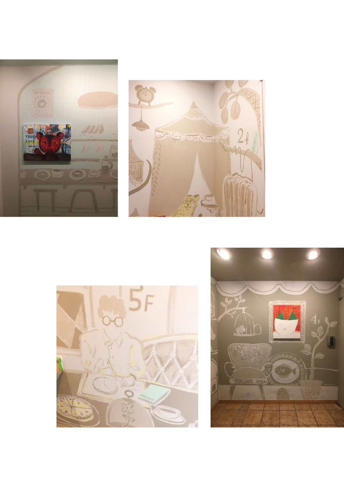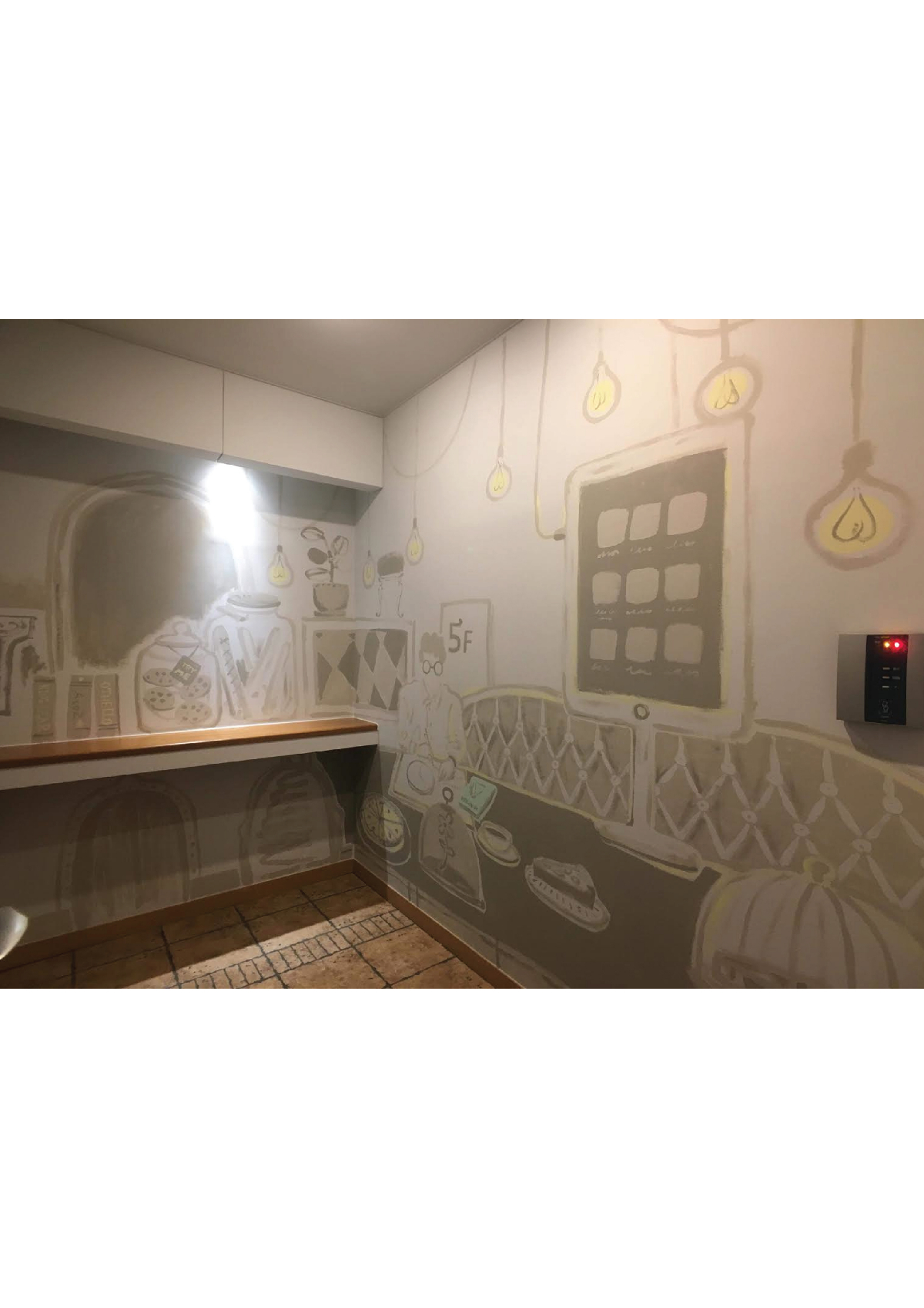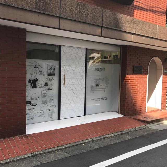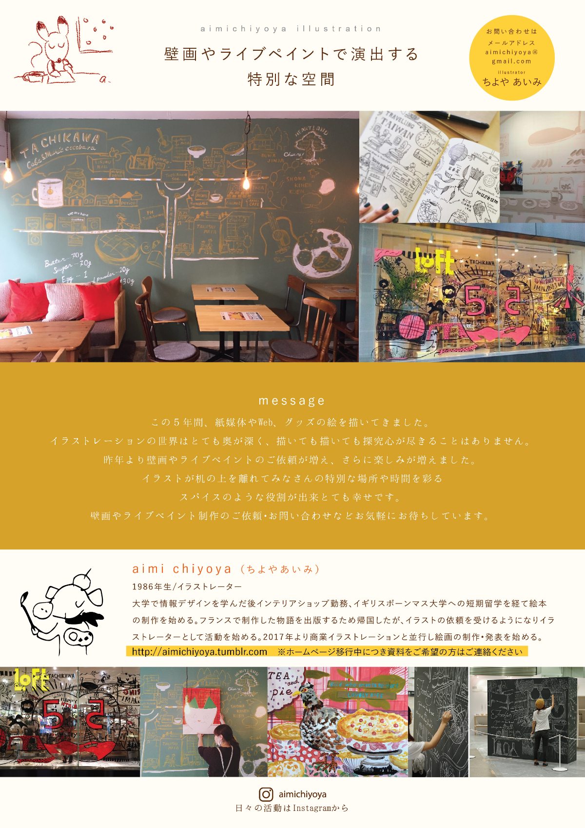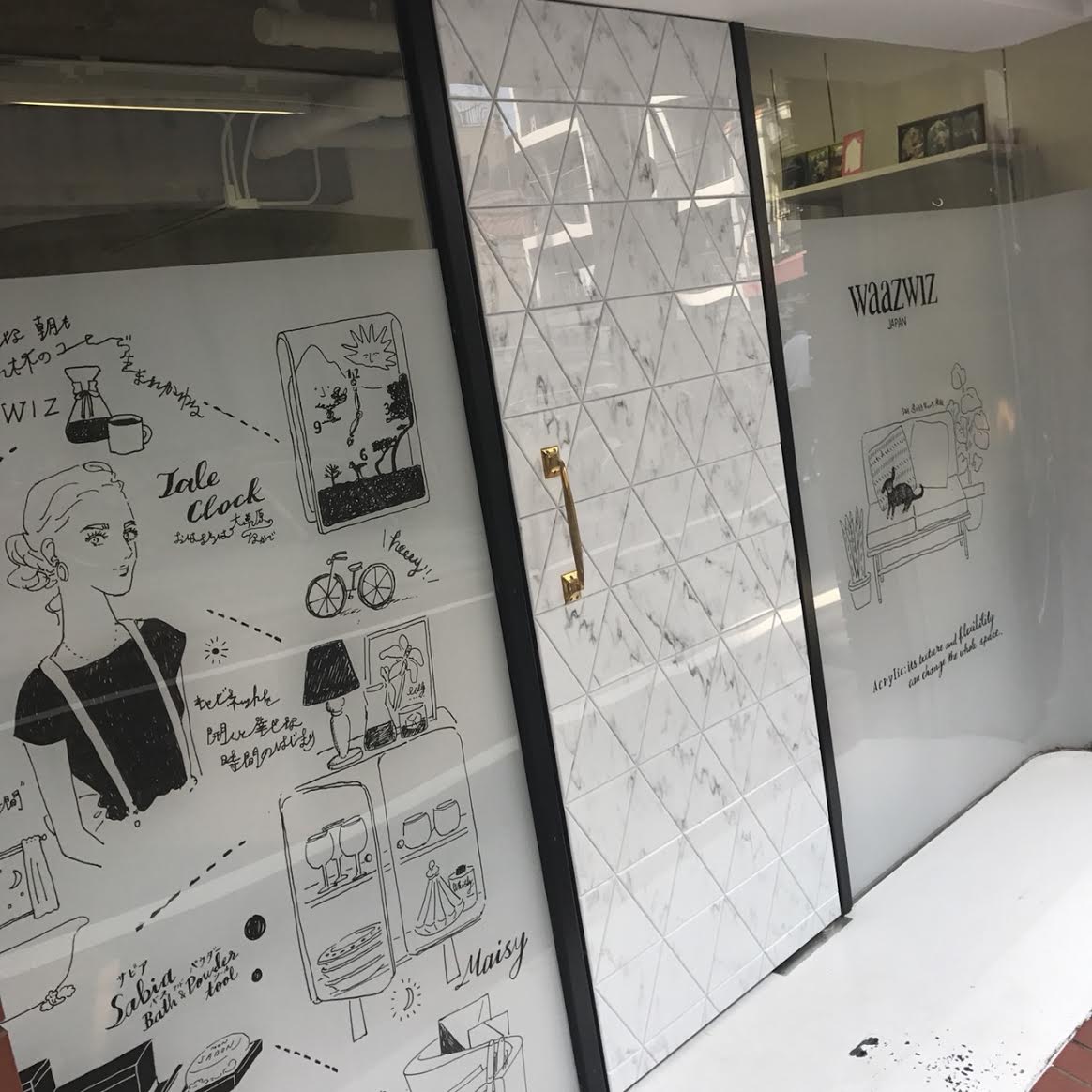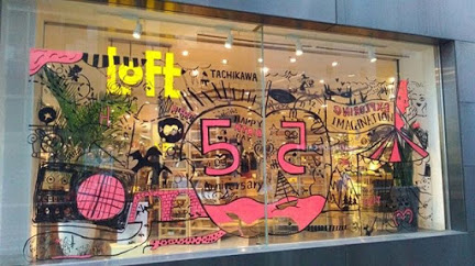 壁画資料 Aimi Chiyoya イラストレーター 立川LOFT さまにて窓ガラスにライブペイント5周年アニバーサリーの期間中展示cafe cocokara壁画映像制作会社さまエレベーターホール壁画アクリルメーカーさまオフィスウィンドウイラスト