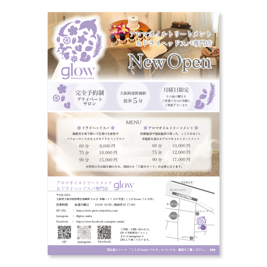 リラクゼーションサロン glow様の新規オープンのチラシデザインを担当させていただきました。