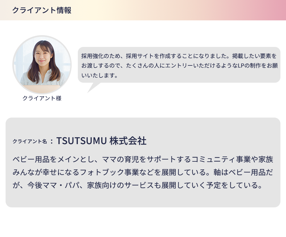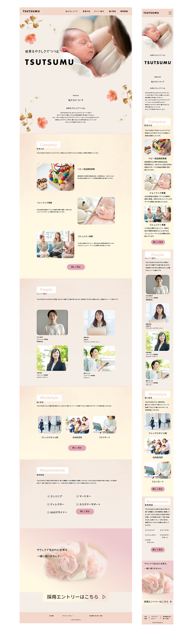 SHElikes MULTI CREATOR COURSEの課題で、ベビー用品事業等を行う企業の採用サイトの制作に取組みました。クライアントからの要件書を元に、PCとSPのデザインカンプを制作し実装を行いました。SP用のレスポンシブ対応もしています。