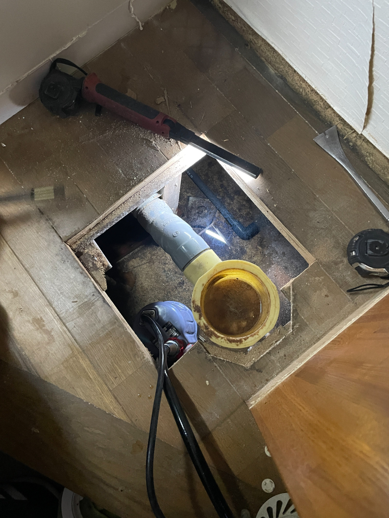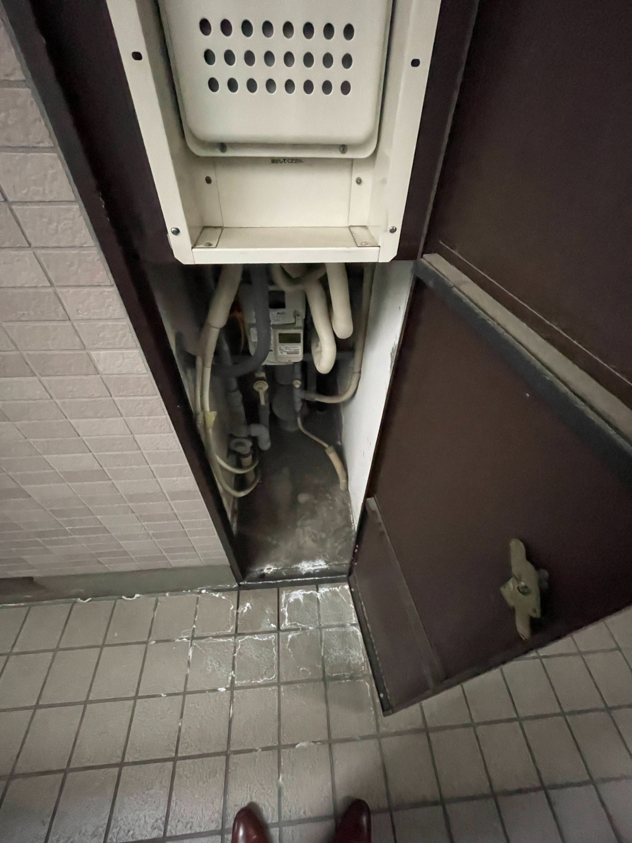 漏水調査を行いました。 【ミノラス不動産】杉山 千明 OVERVIEW 館内のPSからの染み出しから、1F全戸室内を調査。原因は長らく放置されていた、1号室のキッチン水栓からの漏水でした。 床下に多量の水溜まりを確認。1F全室内が同様の状況でした。