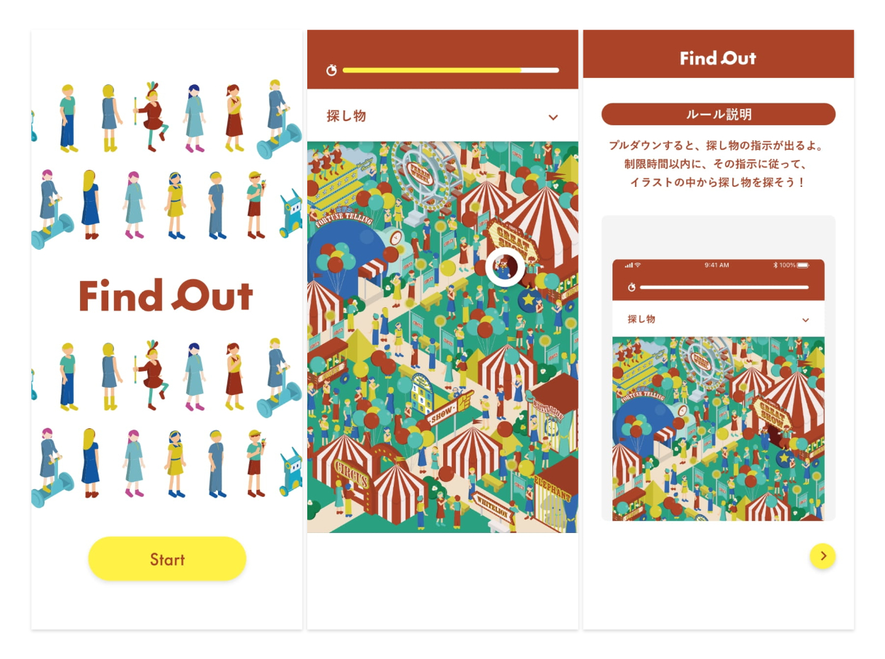 【自主制作】find out 高野広菜_takanohirona WEBデザイナー OVERVIEW 制作物:「ウォーリーを探せ」のアイソメトリックイラスト版 担当:イラスト、企画、デザイン ▲「ウォーリーを探せ」のようなものを、絵本ではなくアプリで出来たら、暇時間に丁度いいなと思い制作したものになります。こちらは実装はしておらず、デザインのみになります。
