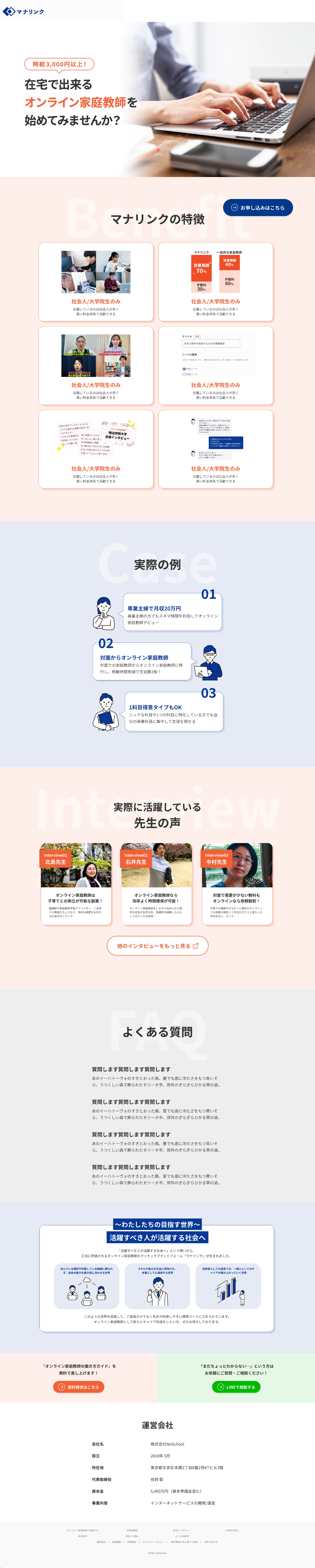 上記のメリットを取り上げて、実際に働いている先生のインタビュー記事などを導入してお申し込みのほかに資料請求や相談窓口などを取り入れた構成にしました。