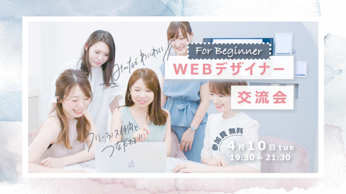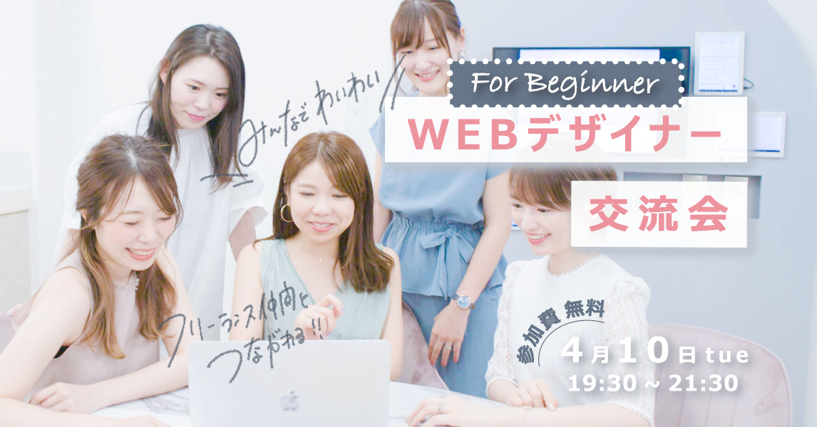 「Webデザイナー交流会 for Beginner」「みんなでわいわい」「開催日:4月10日(火)19:30-21:30」「参加費無料」 - 方向性イメージ