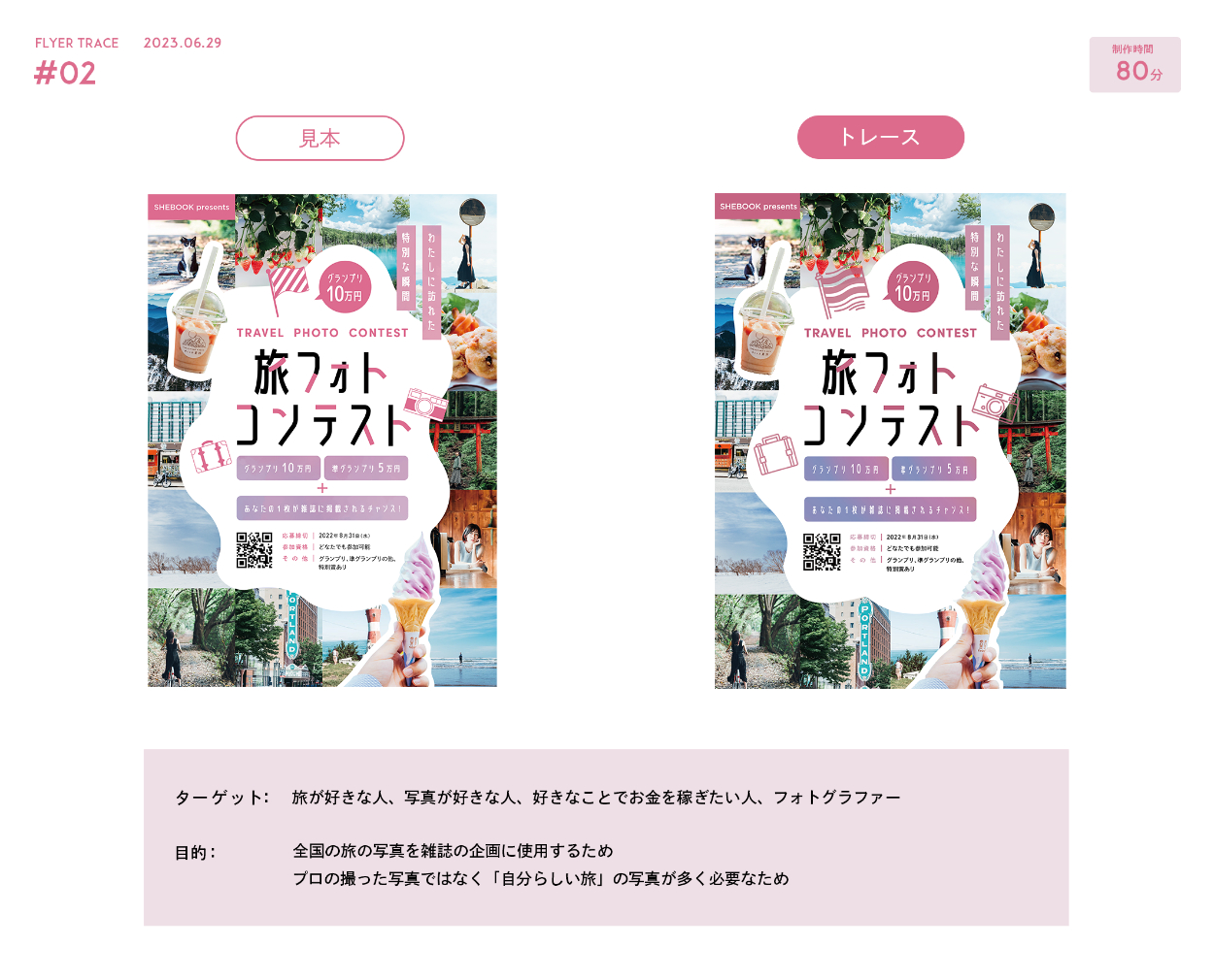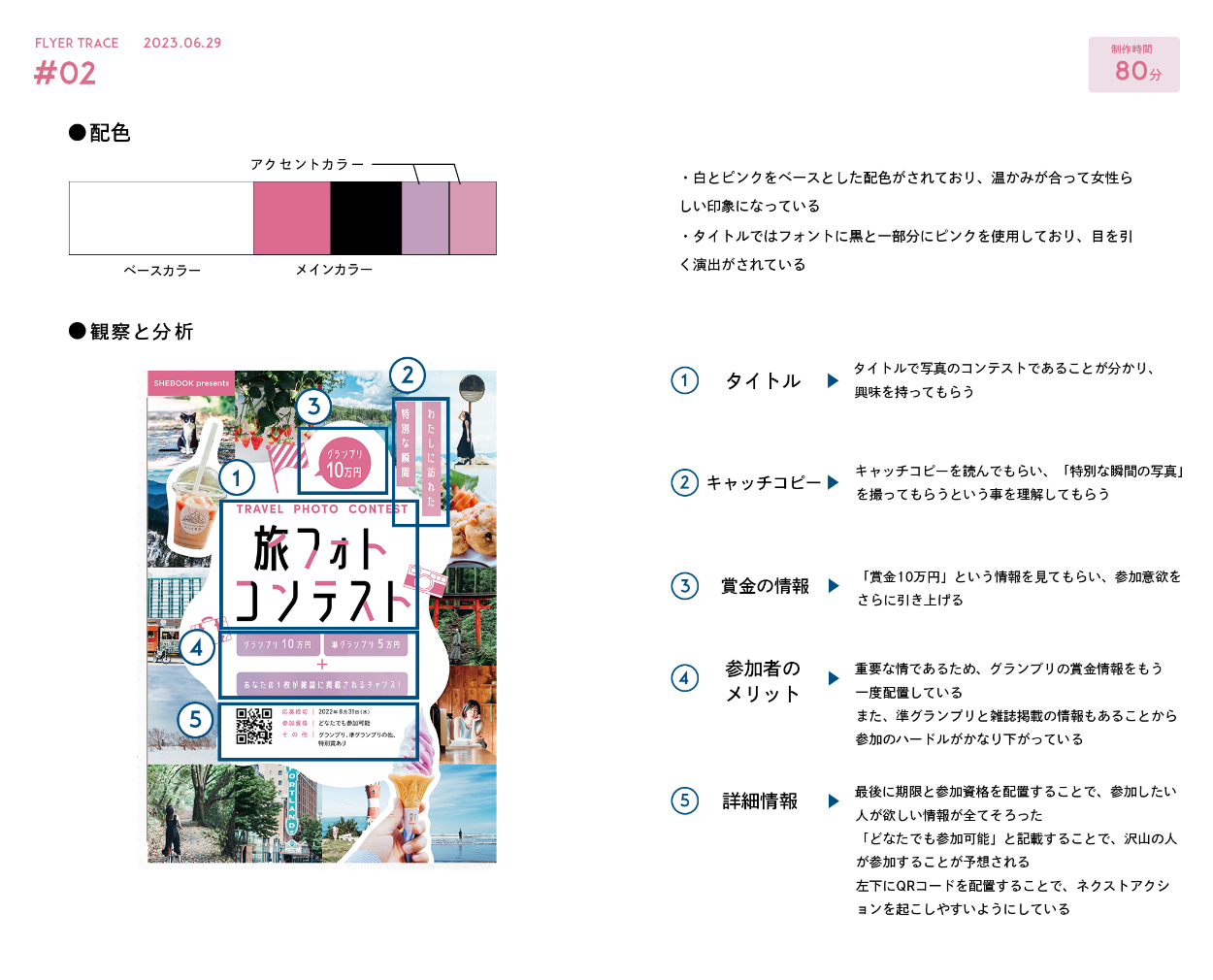 SHElikesの制作課題として、フライヤートレースに取り組みました。「ターゲット」「目的」「配色」「視線誘導」の分析結果もまとめています。 [制作時間:80分/まとめ30分/使用ツール:Illustrator/Photoshop]