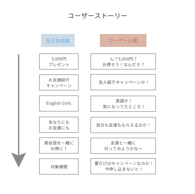 このバナーを見た人がどう感じて行動していくかを考えて、ユーザーストーリーを設計しました。今回、バナーの「5000円」「プレゼント」が目に入り、「お??」と興味をもってもらえるようにデザインをしました。その後、何の広告でいつまでなのかが分かるように、要素を配置しています。