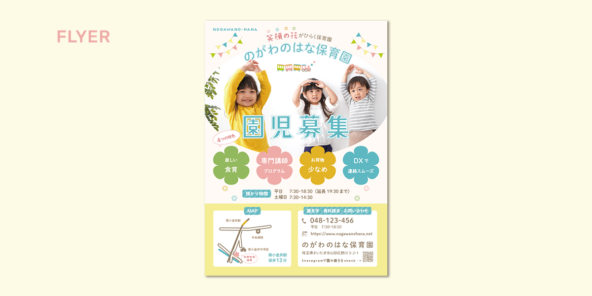 「笑顔の花」「園児募集」:デザイン性が高いもので強調。