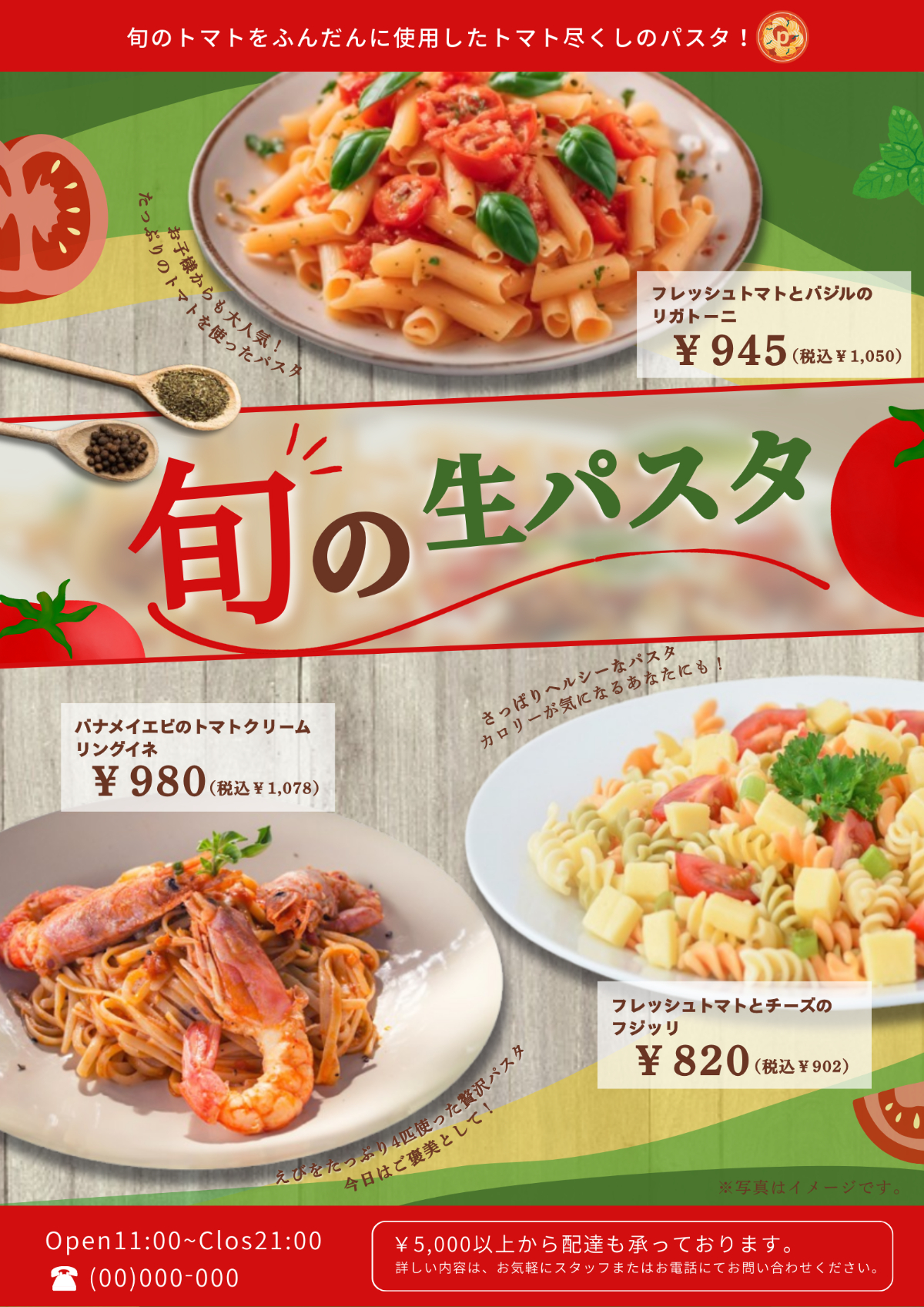 パスタの写真には影を付けることで立体感が生まれ、自然と一番にパスタに目がいくようにしました。