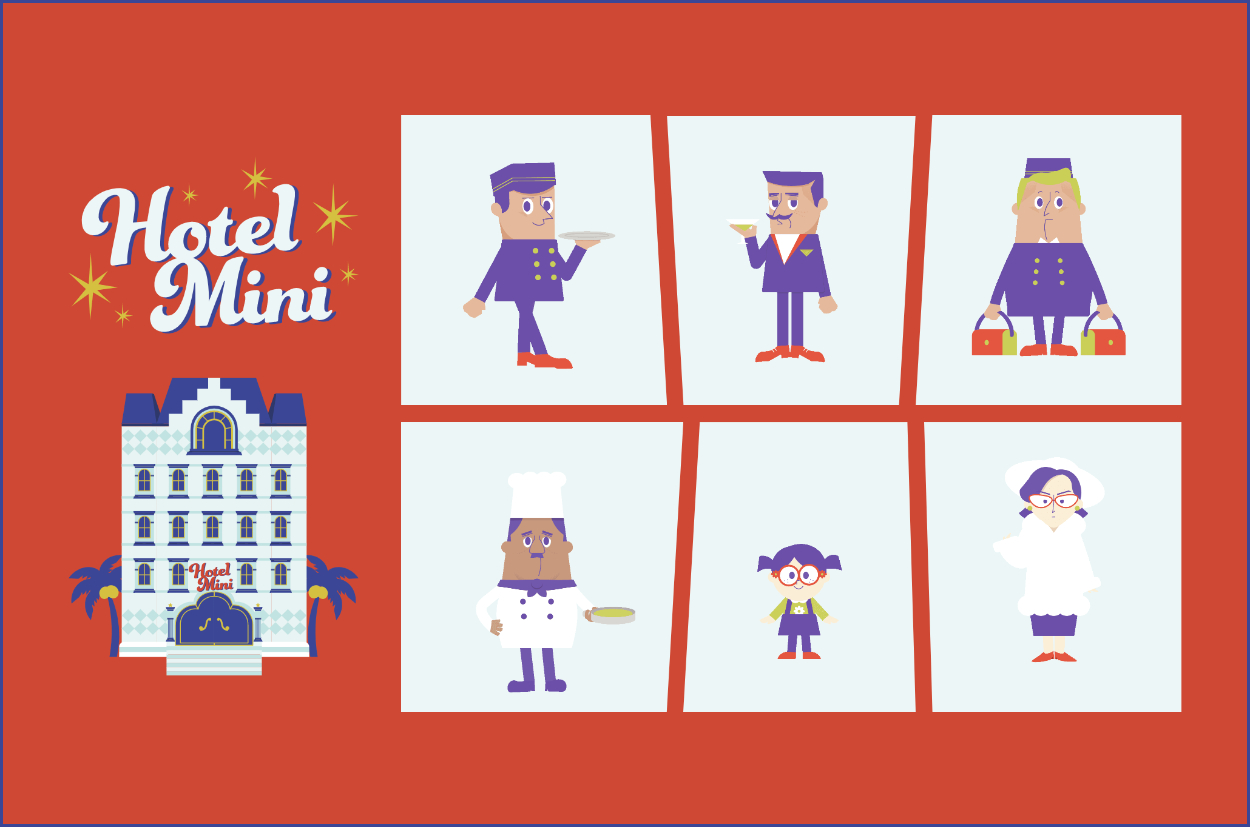 制作物:架空のホテル「Hotel Mini」と、そこで働く個性豊かな従業員達を紹介するサイト 担当:キャラクターデザイン&イラスト、サイトデザイン