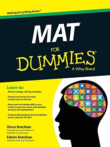 Score your highest on the MAT? Easy.The MAT exam is one of the hardest intellectual challenges in the field of standardized testing. Students preparing to take this exam need a chance to practice the analogy skills necessary to score well on this test, which MAT For Dummies provides with its six full-length practice tests and plethora of other test preparation suggestions.MAT For Dummies includes test-specific analogy strategies, practice and review for each content area, word/terms lists covering the major subject categories, and six practice tests with detailed answer banks.Goes beyond content knowledge and teaches you the test-taking skills you need to maximize your scoreIncludes six full-length practice tests with complete answer explanationsHelps you score high on MAT exam dayIf you're a potential graduate student preparing for the MAT, this hands-on, friendly guide helps you score higher.