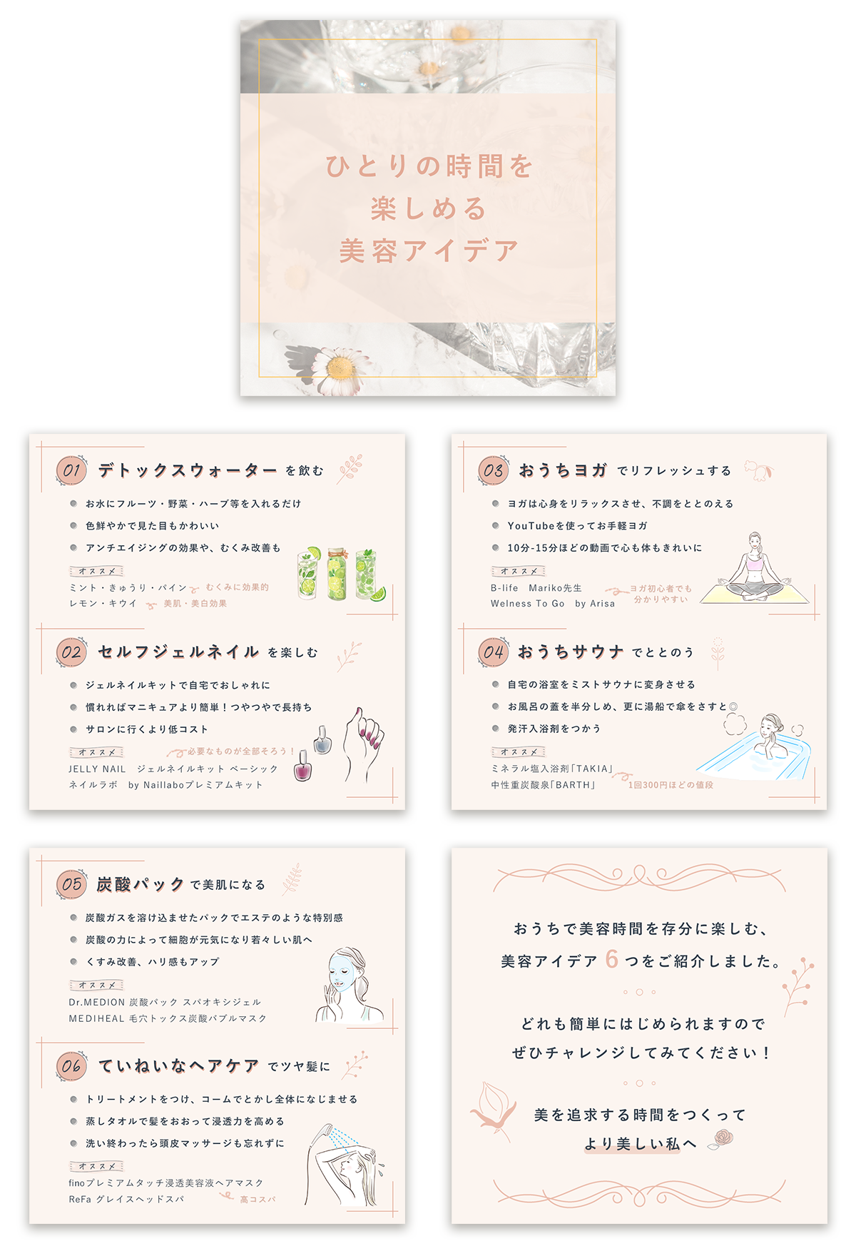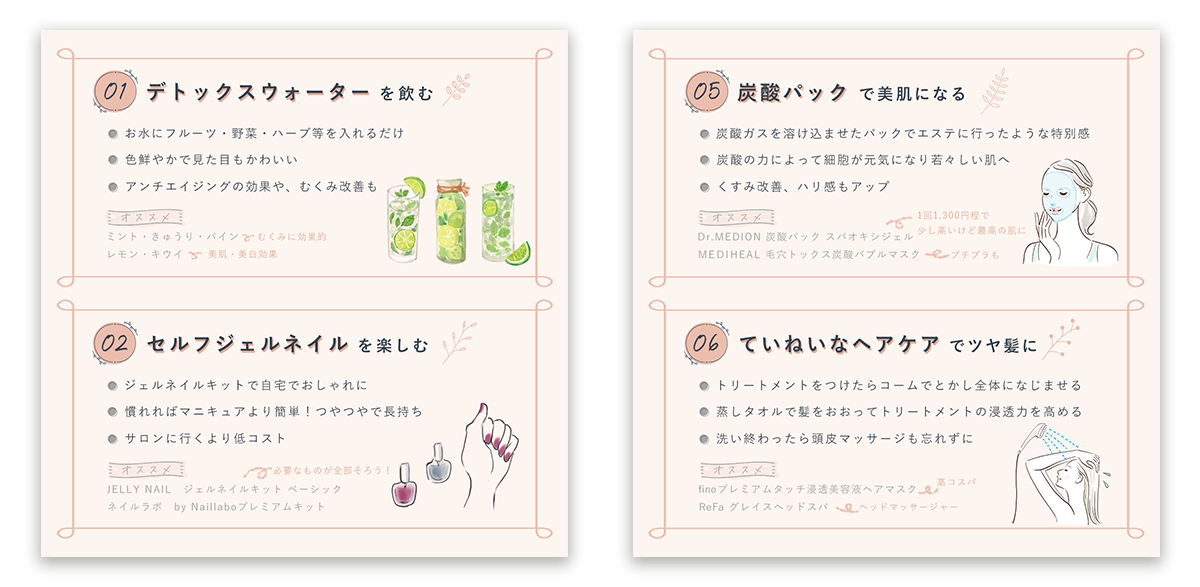 ・美容アイデア提案なので、女性らしい雰囲気になるようエレガントなフレームや柔らかいイメージのイラストを使用。