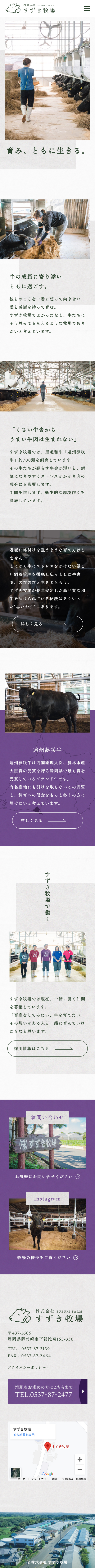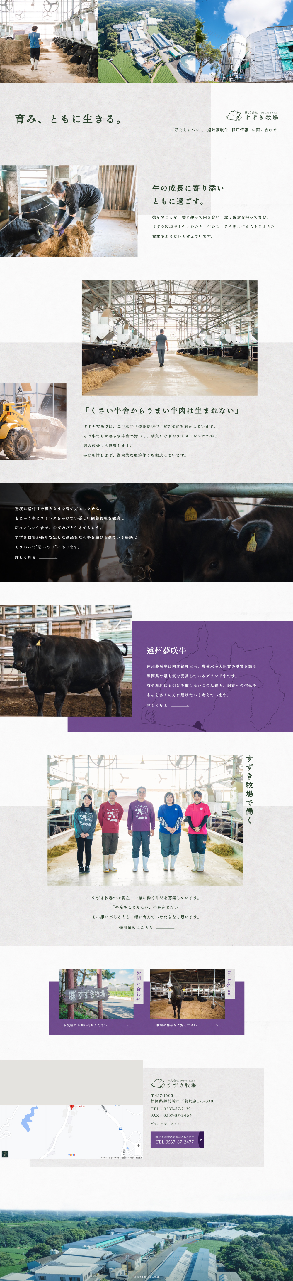 清掃の行き届いた明るく綺麗な牧場のイメージに合わせて、余白の広いシンプルで明るいデザインにしました。 茶畑や豊かな自然に囲まれた牧場ですので、文字色には緑を使用しました。 アクセントに使用した紫は、夢咲牛のイメージカラーになります。 求人サイトからこちらのサイトに飛んでこられた求職者の方に、業務内容や牧場の様子がわかりやすいように、下層ページにも写真をたくさん使用しました。