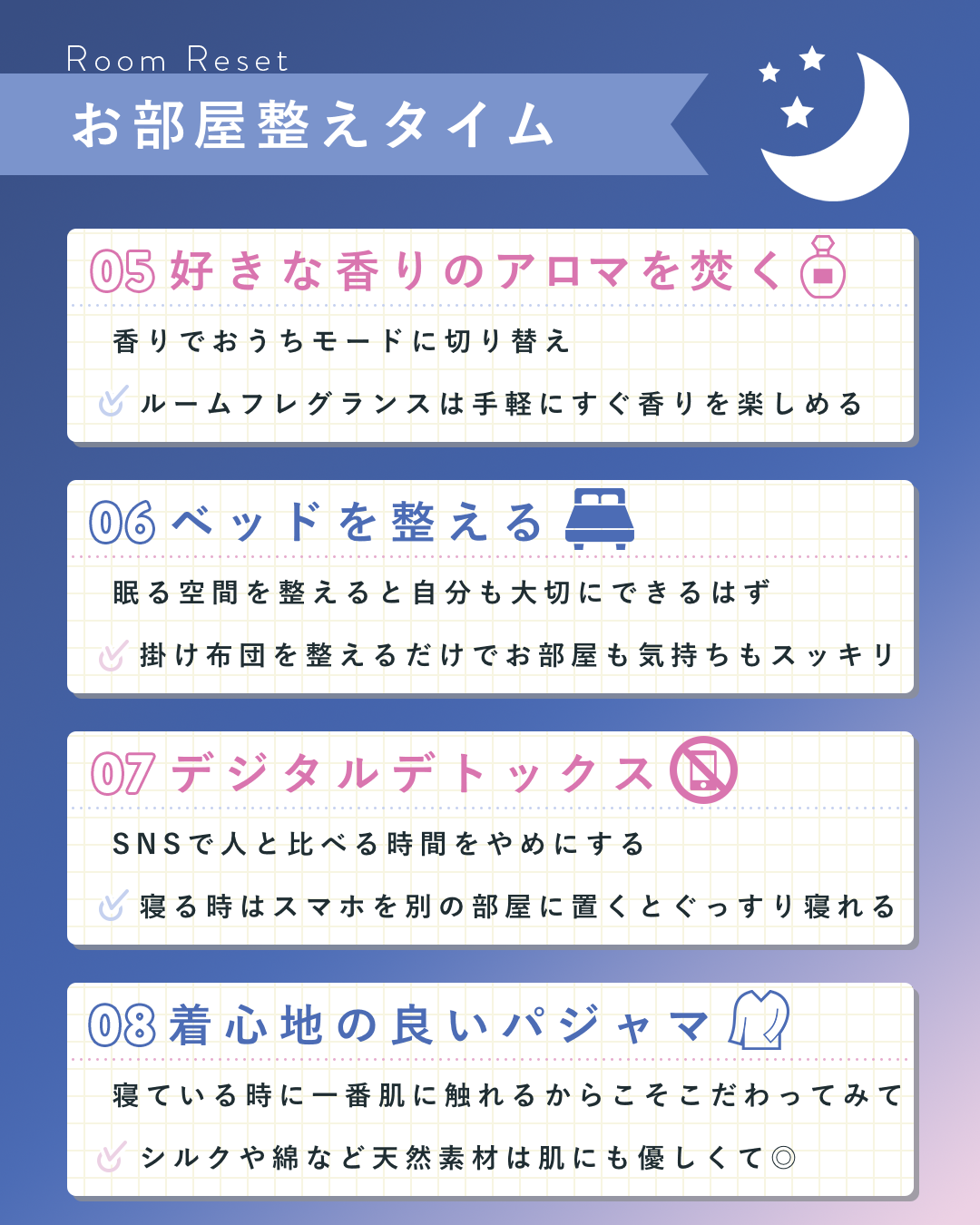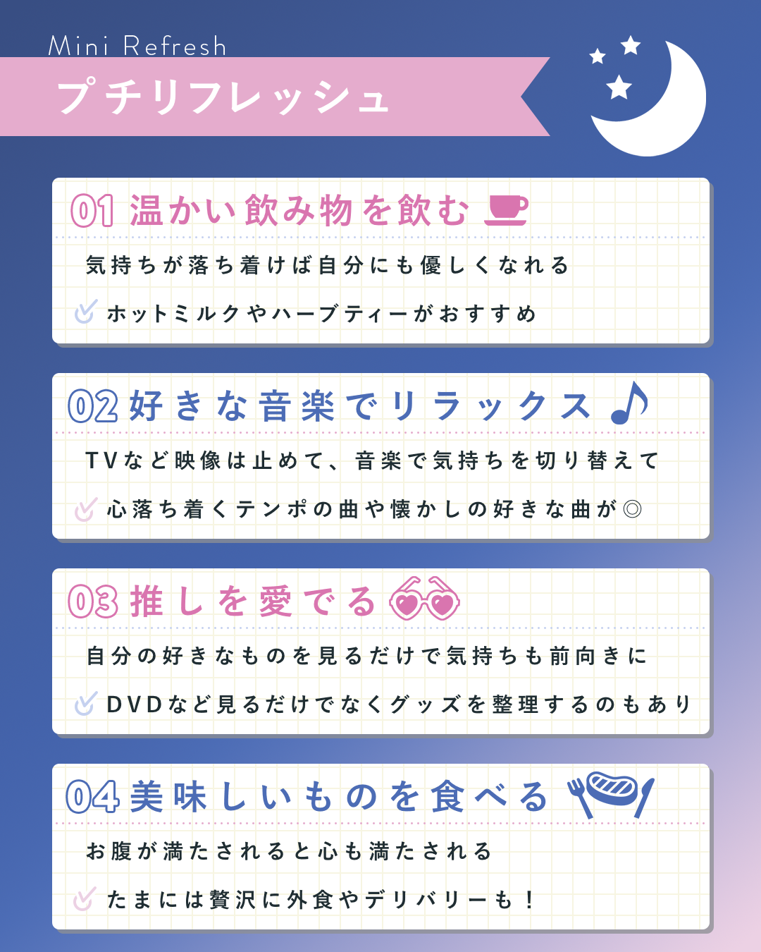 夜の過ごし方ということで、背景は夜空をイメージし、夜明けには明るい気持ちになれるようにピンクをグラデーションで少し加えました。