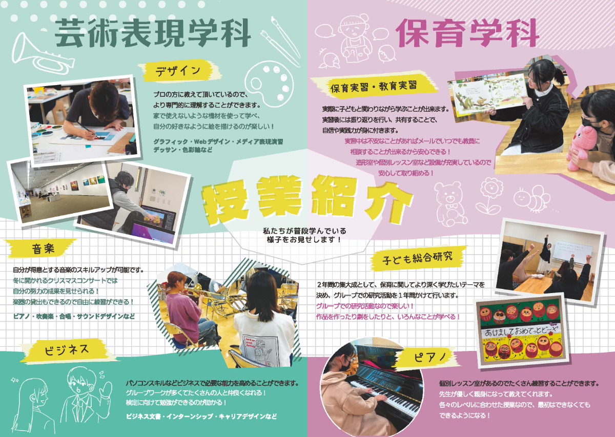 昨年の11月に山口芸術短期大学同窓誌の、授業紹介ページ作成のアルバイトに取り組みました。応募した理由は、実際の印刷物になるデザインに携わりたかったことと、授業を通してグラフィックデザインに興味を持っていたからです。制作は私含め学生3名で行い、私はデザインと制作を担当しました。