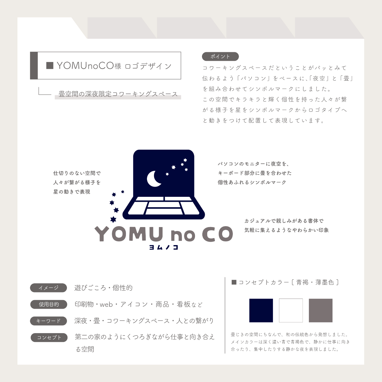 【制作実績】YOMUnoCO様 ロゴデザイン KEIKO UEDA デザイナー/イラストレーター OVERVIEW 2024.9.28/制作時間:1ヶ月/制作ツール:illustrator/事業内容:深夜限定、全面畳敷のコワーキングスペース/コンセプト:第二の家のようにくつろぎながら仕事に向かえる空間 YEAR 2024