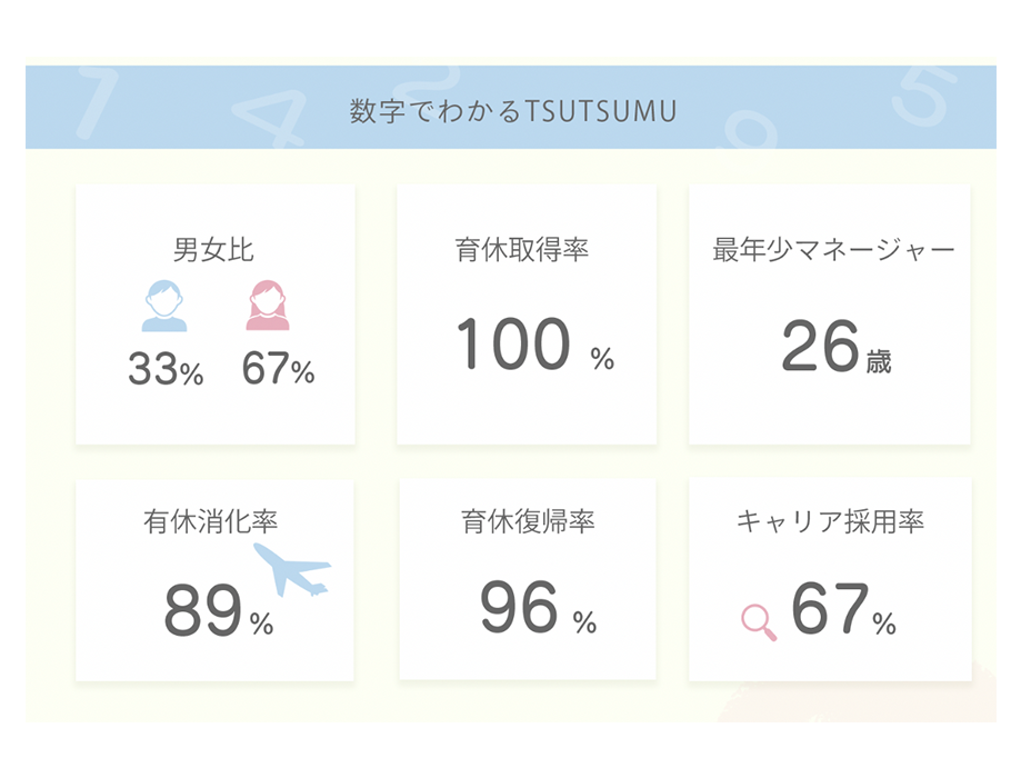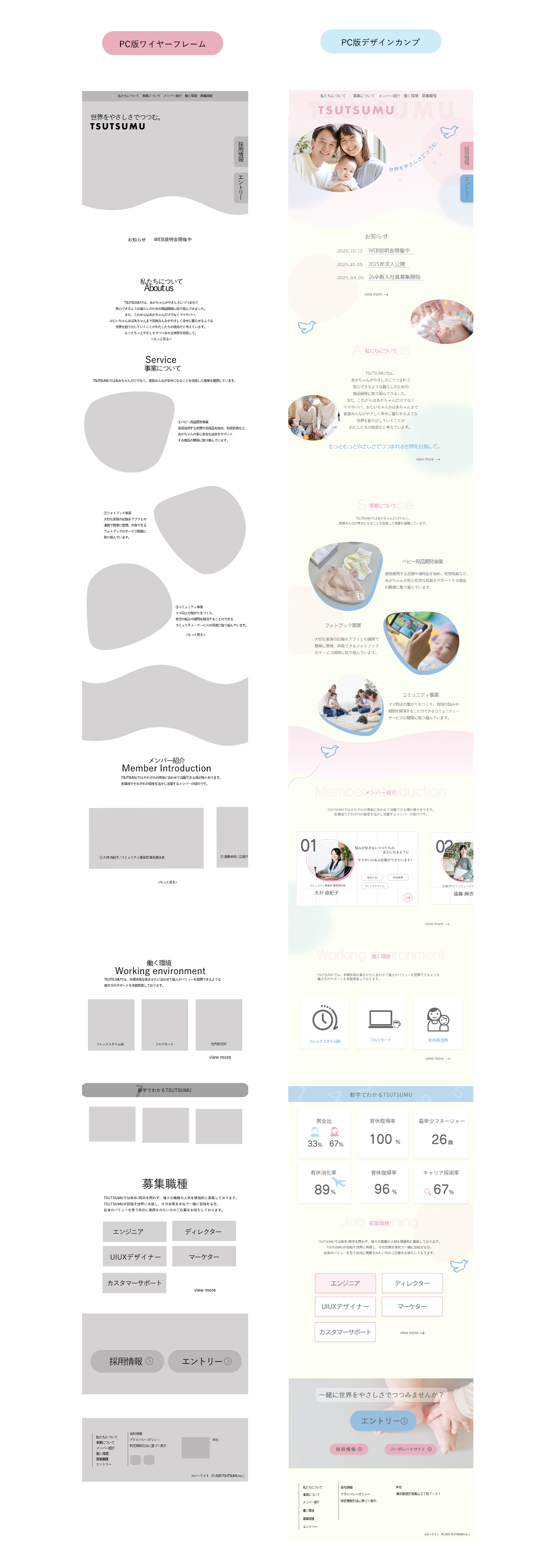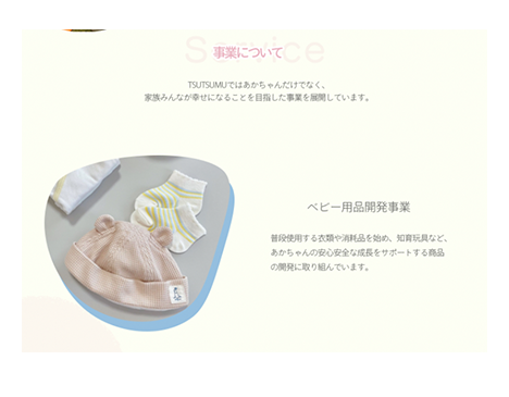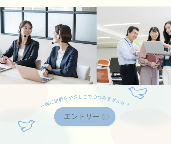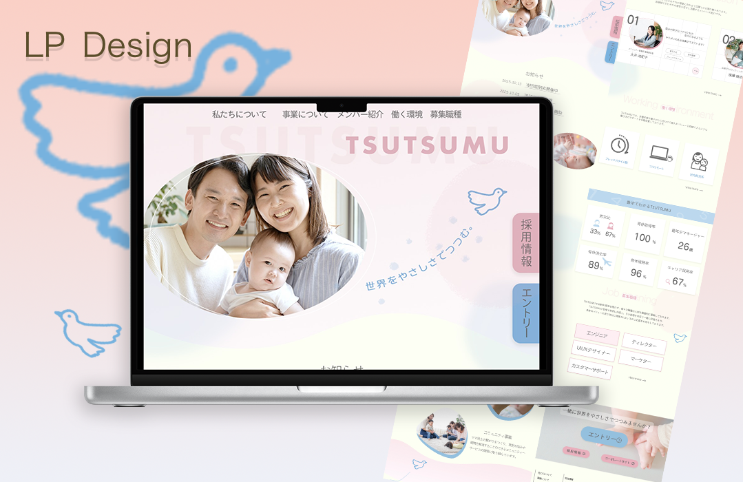 ・赤ちゃんの羽ばたくような成長と新たに入社してくる社員の活躍イメージした鳥をLPの各所に配置した。「世界をやさしさでつつむ。」を羽ばたく鳥から出ているように見せている。