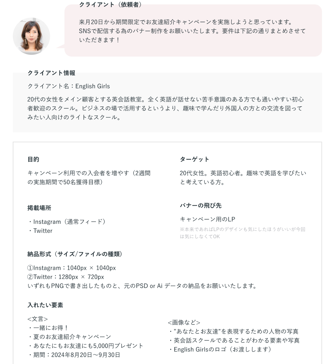 要素をスッキリ見せるためカーニングを整えました。視線誘導を意識した情報設計をしました。依頼文にあった可愛さとポップさに加えて、夏のキャンペーンだったので夏らしい爽やかさを出す配色を考えました。フィードバックを参考に写真の加工でAIを使用して長袖を半袖にしました。