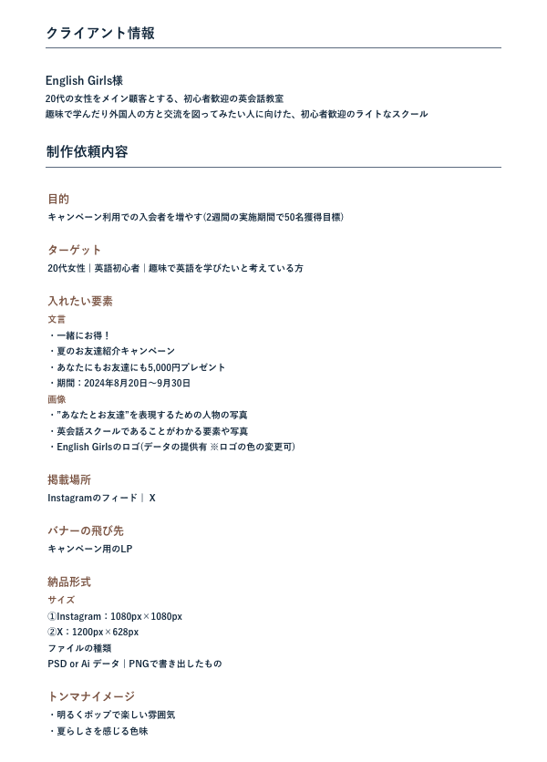 SHElikes PRO デザイナーの課題で、架空の英会話スクールからの制作依頼内容をもとに情報設計とビジュアルデザインを行い、InstagramとXの配信に用いるバナー制作に取り組んだ。