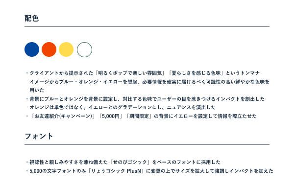 デザインの基礎知識の学習とバナートレースを通して得た知見をふまえて、ユーザーストーリーを考えながら、クライアントの依頼要件を満たす情報設計とビジュアルデザインをする方法を学んだ。