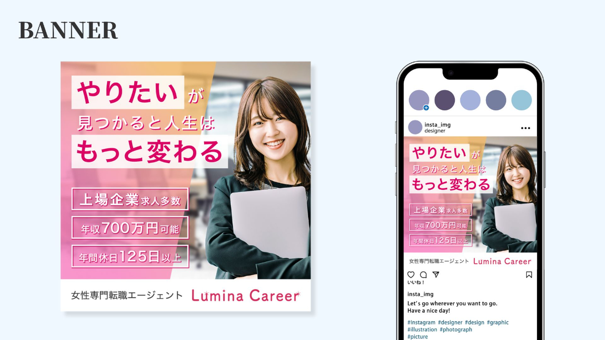 20代後半の女性向けに、女性向け転職エージェントのInstagramバナー広告作成を行いました。『キャリアアップやキャリアチェンジへの挑戦』をテーマにデザイン、画像選定、メインコピー以外のライティングを行いました。※自主制作※