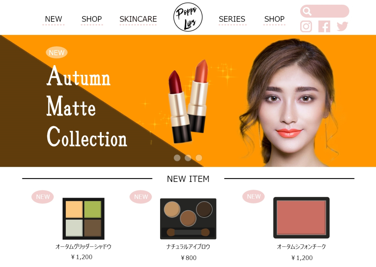 韓国系コスメサイト。18歳~20代後半向け。韓国特有の華やかな色合いをメイン画像で