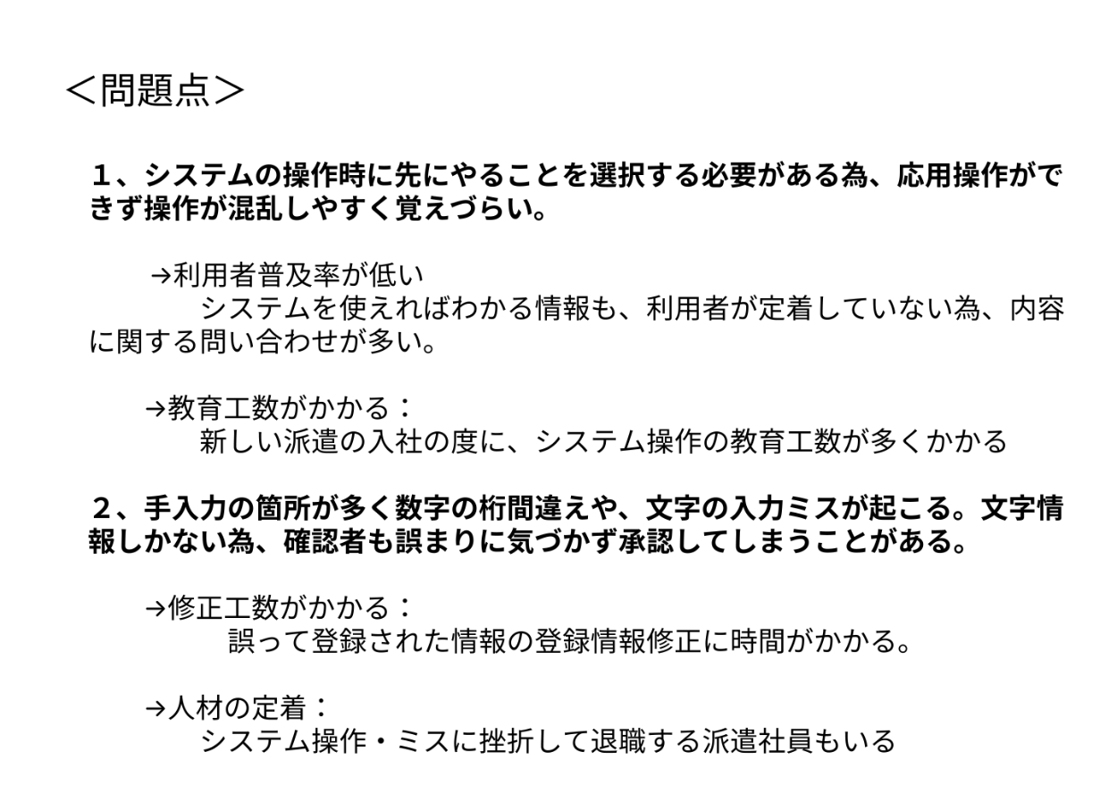 現行システムの主な問題点です。「使いづらい」「分かりにくい」という点から派生して、いくつかの問題を生み出しています。