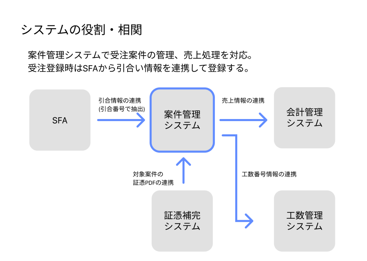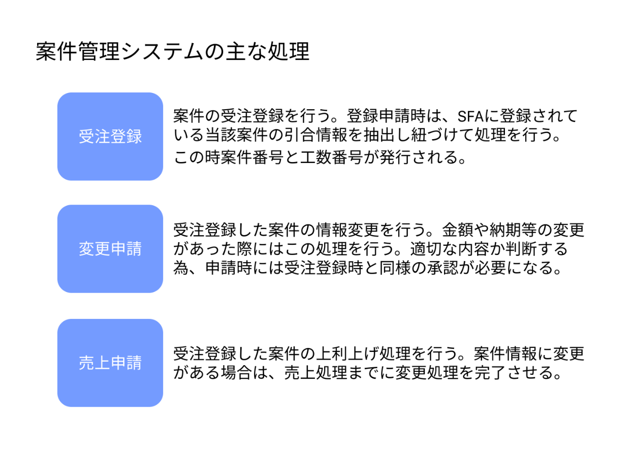 その為、案件管理システム上で1から受注情報を登録することはなく、必ず事前にSFAに登録された引合情報と紐付け、引き継ぐ形で登録処理を行います。