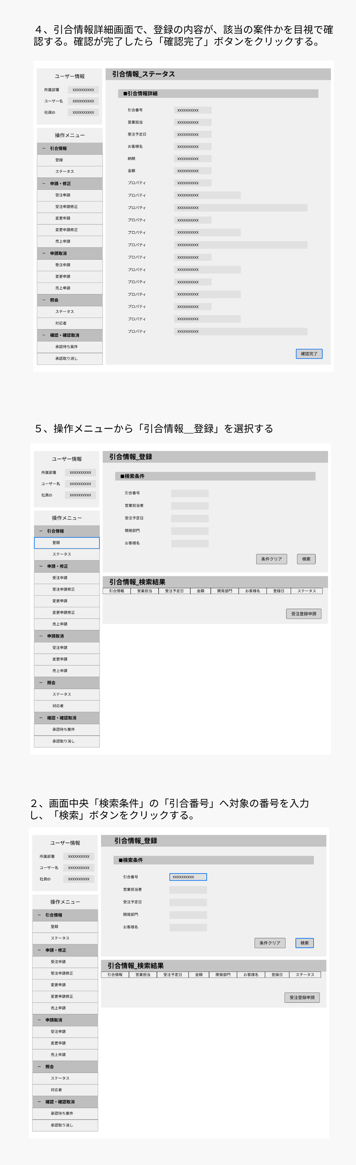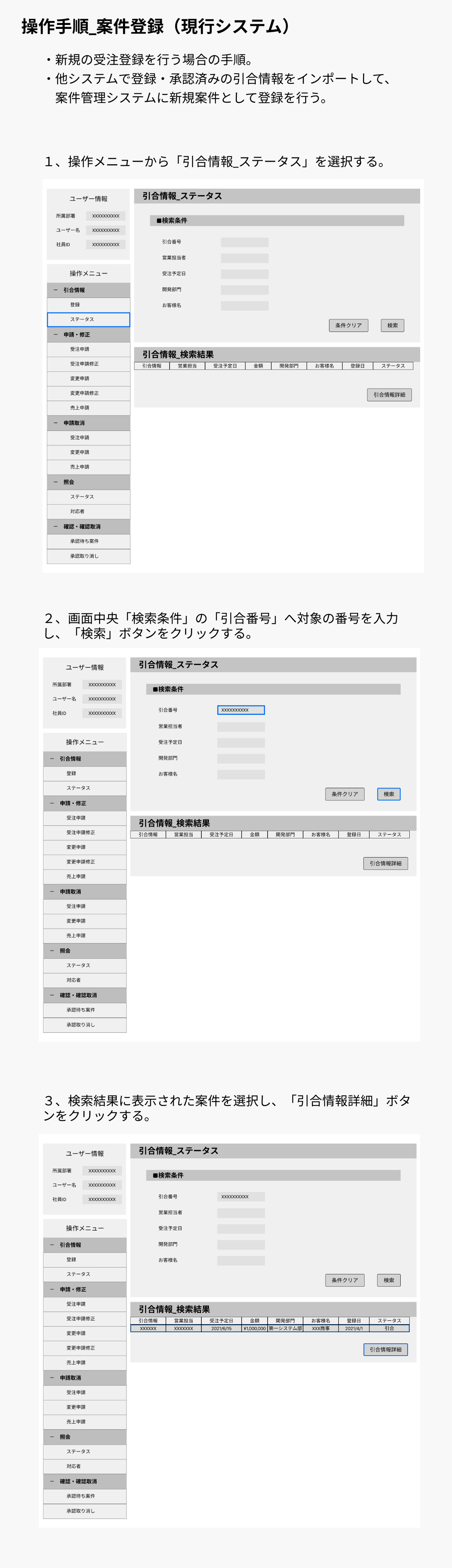 現行版の操作では案件詳細・ステータスの確認と受注の登録をそれぞれ別メニューから呼び出し操作する必要がありましたが、対象案件を呼び出し、内容をかくにんしてそのまま受注登録処理に進めるように変更しました。