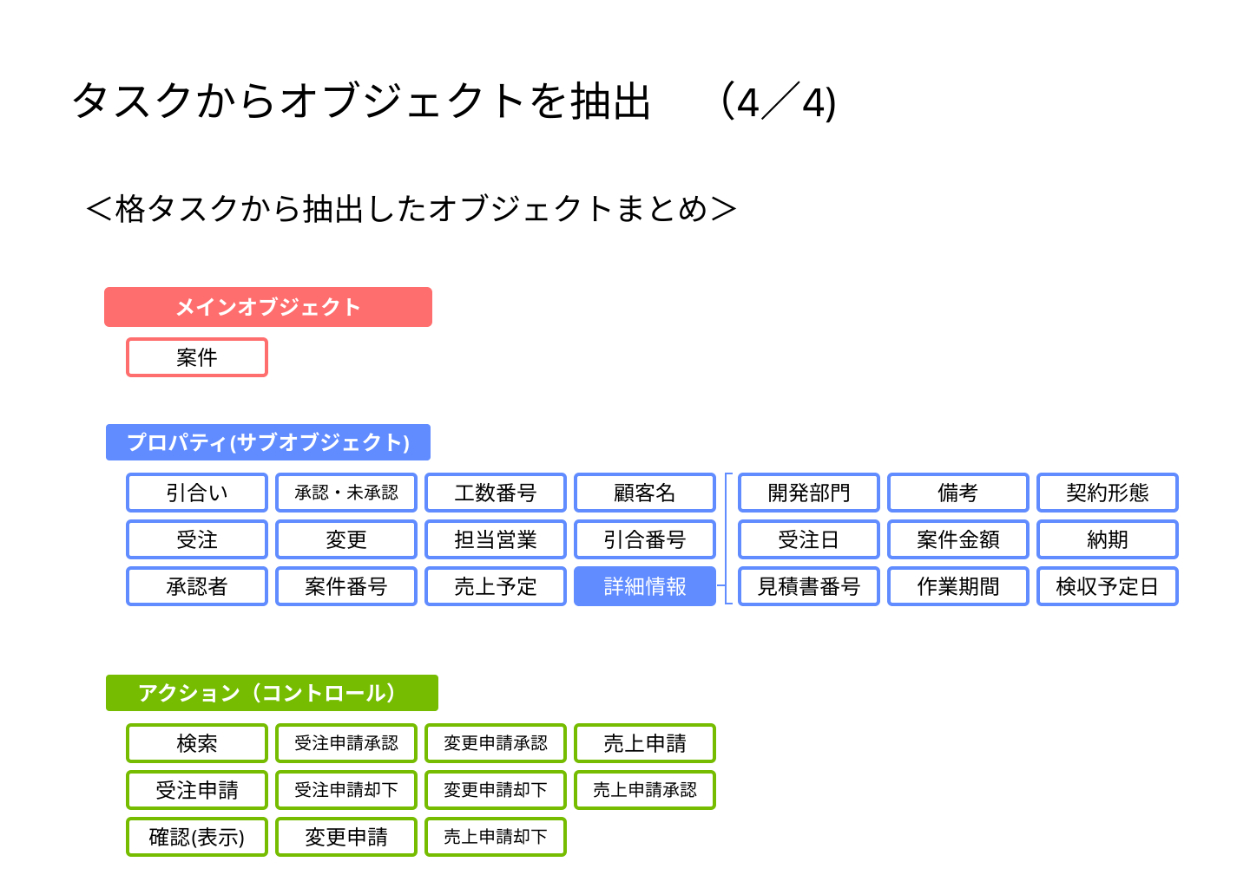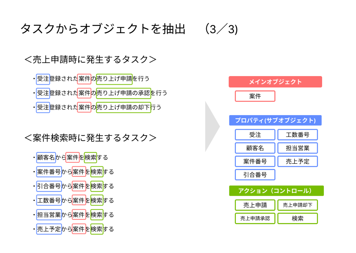 案件管理システム上で行われる主なタスクから、オブジェクトを抽出しました。