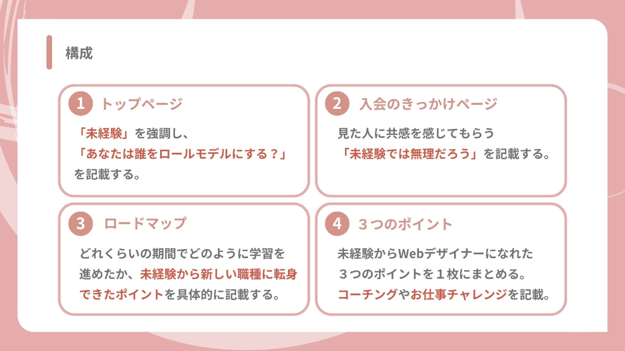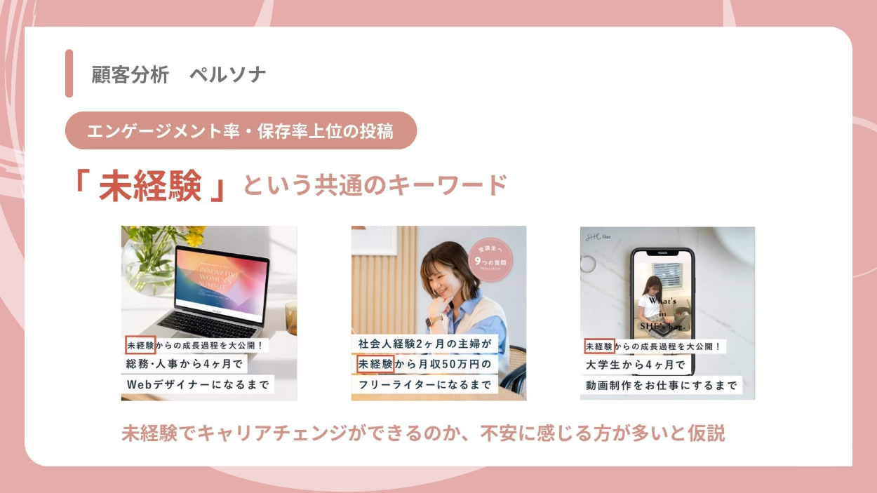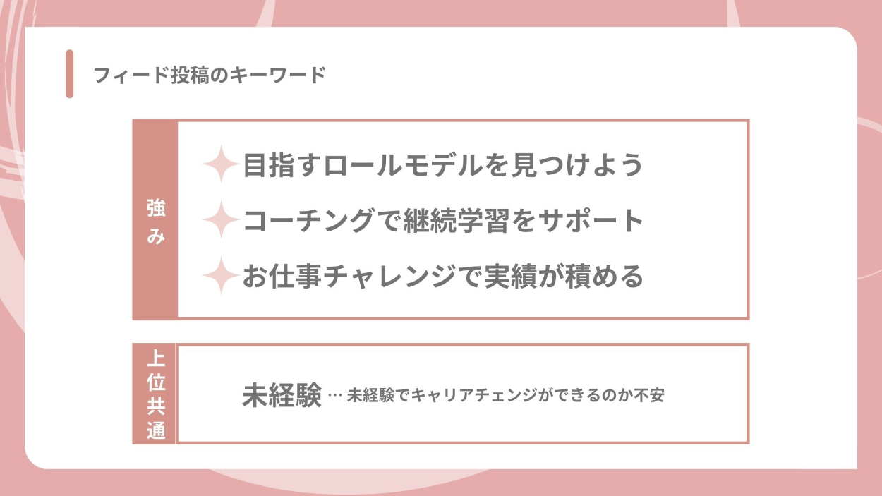 過去のフィード投稿でエンゲージメント率や保存率の高かった投稿の共通点として、 「未経験」というキーワードが挙げられます。トップページに「未経験」の記載を入れることで興味を引くようにしました。