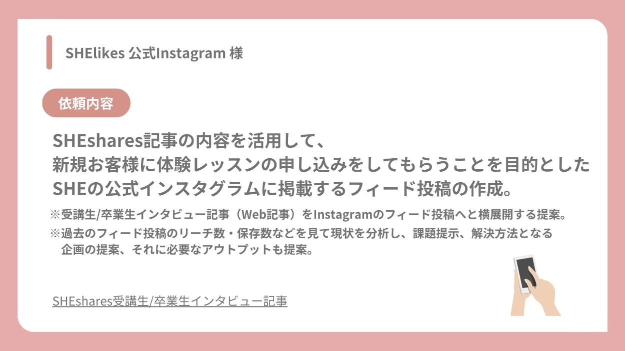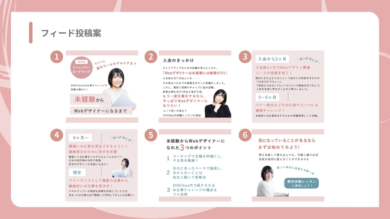 SHEshares記事の内容を活用して、新規お客様に体験レッスンの申し込みをしてもらうことを目的としたSHEの公式インスタグラムに掲載するフィード投稿の作成。