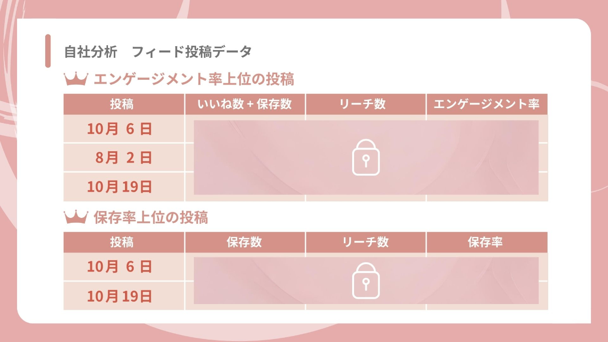 ※過去のフィード投稿のリーチ数・保存数など見て現状を分析し、課題提示、解決方法となる企画の提案、それに必要なアウトプットも提案。