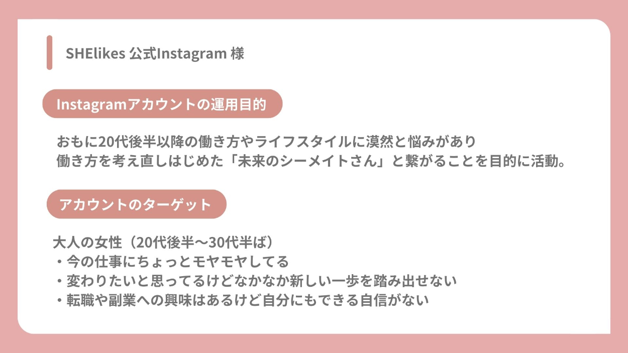 投稿のデザインについては、SHElikes公式アカウントに馴染むデザインで制作する。