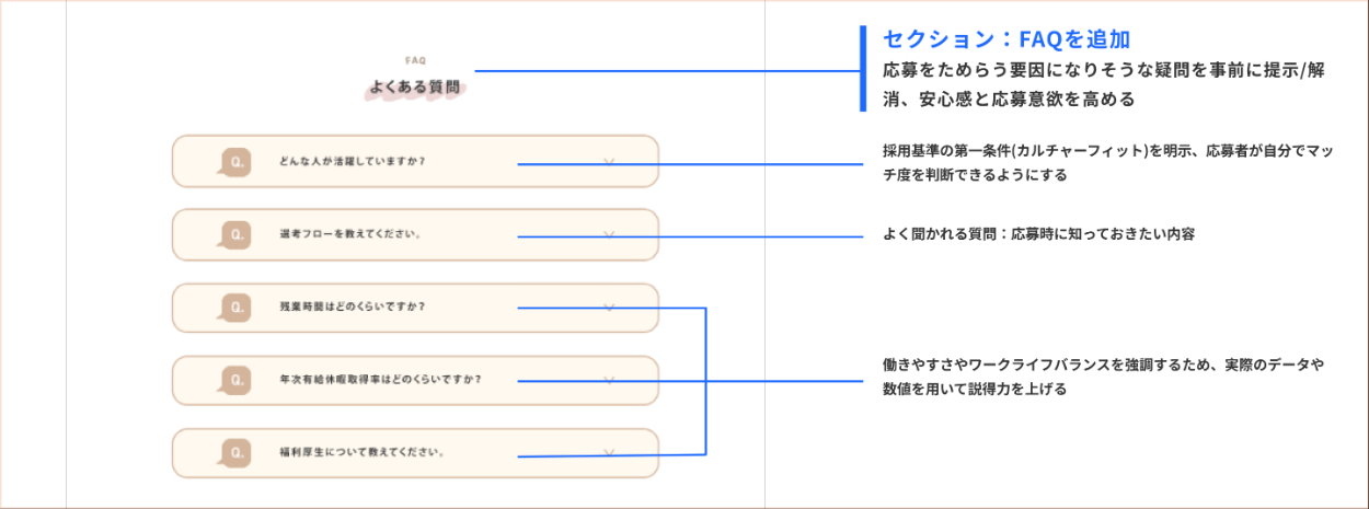コーディング段階で「この並びで本当に伝わるのか?」と疑問を持つ場面があり、デザインカンプの段階で情報設計の意図がデザイン反映されていないことに気付きました。セクションの順序や情報のポイントを整理することでユーザーに意図が届きやすいLPになることが分かりました。