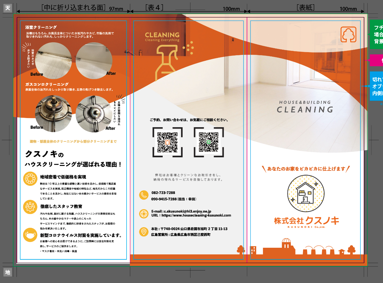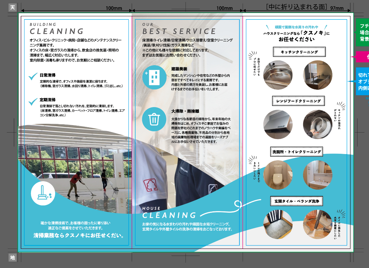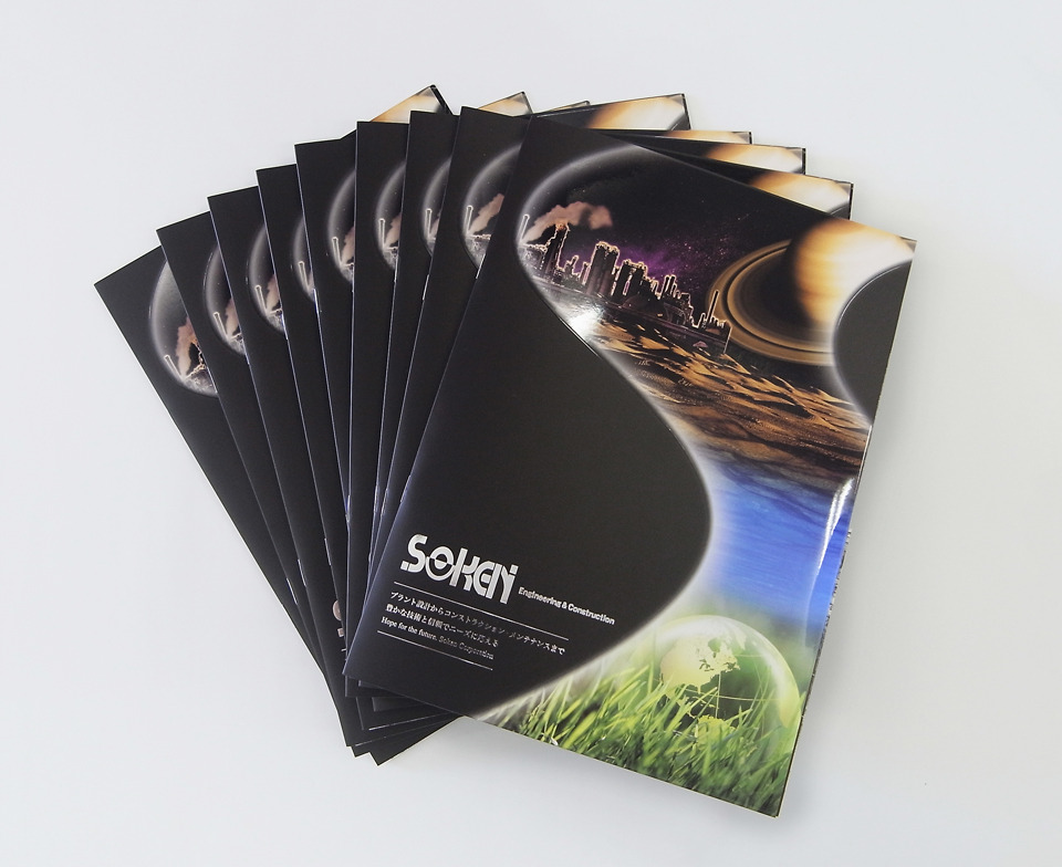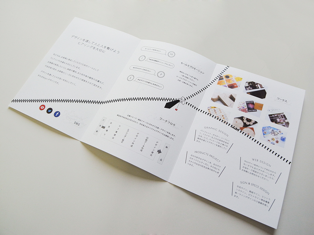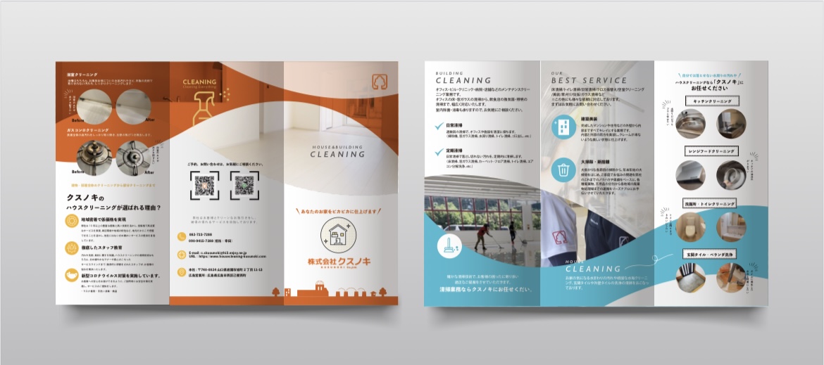 業務エリア開拓の為、会社パンフレットを作りたいとのご依頼でした。店舗様への設置や持ち帰りやすさなど考え、コンパクトにリーフレットタイプにし、CIカラーとクリーン感のあるビジュアルで製作しました。