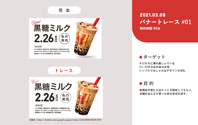 ・バナートレースを通して得た気づきをまとめたシートの配色は、一部バナーから引用することでバナーとの統一感を出しました。また、2ページともにRを一部に取り入れることで2枚につながりが感じられるように意識しました。