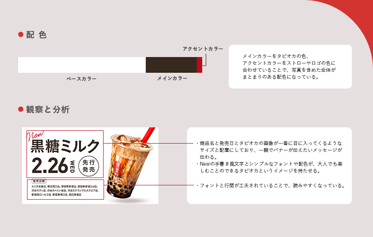 ・タピオカドリンクのストローの色がアクセントカラーに、ベースカラーにタピオカの焦げ茶色が使用されているなど、情報量が多くても全体的にまとまるような配色がされている。