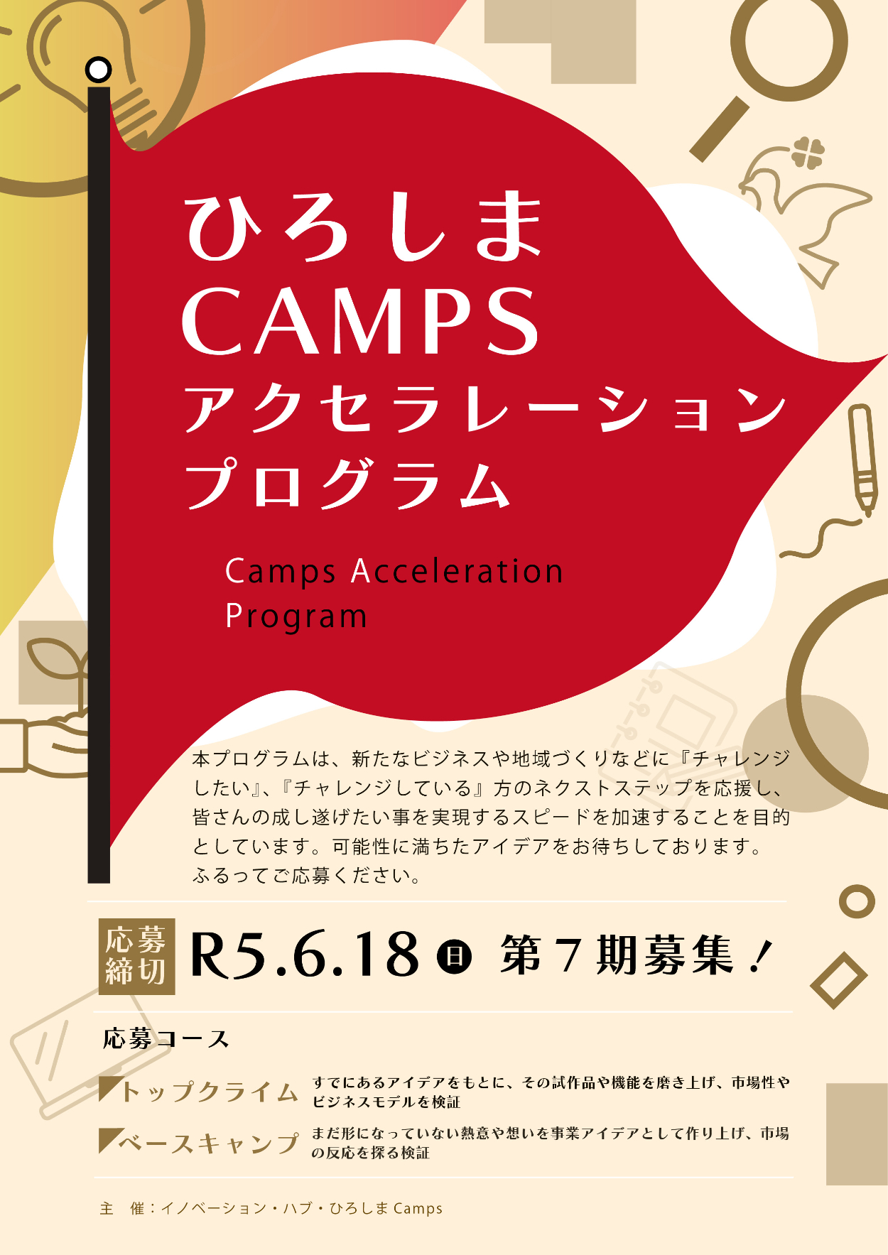 イノベーションハブひろしまCampsが実施する「ひろしまCAMPSアクセラレーションプログラム」の募集フライヤーを製作しました。[使用ツール:Illustrator]