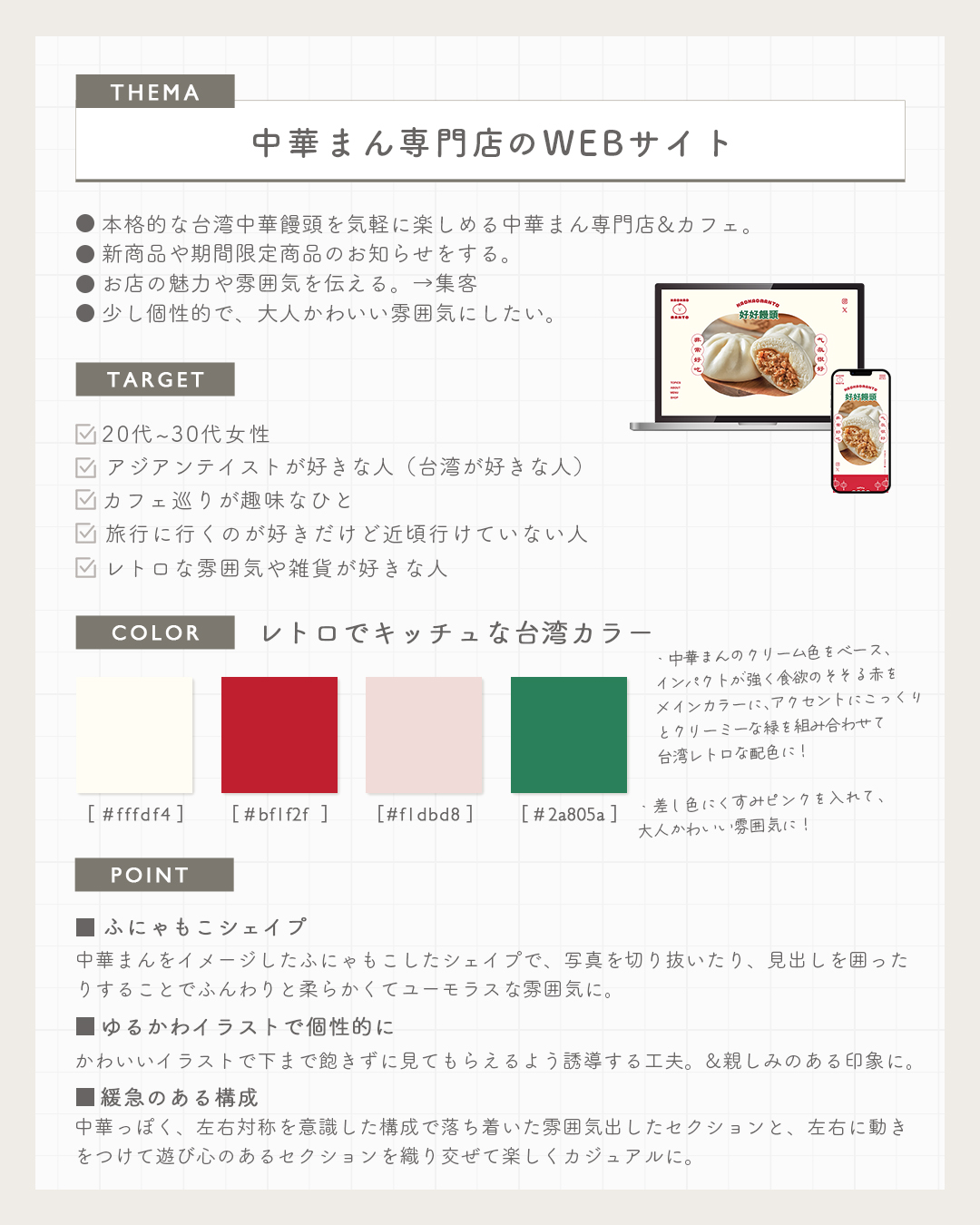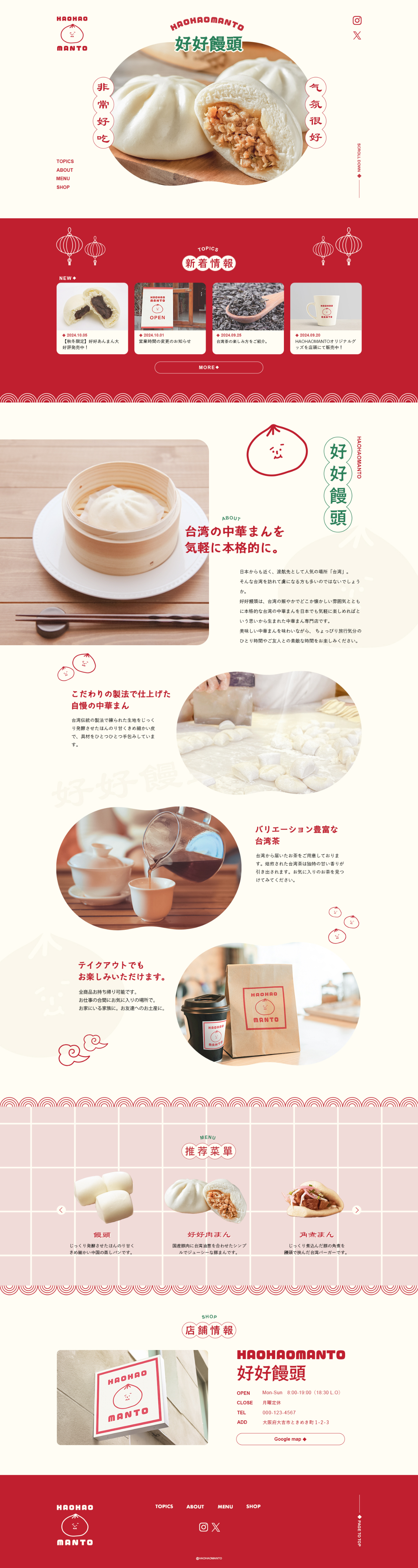 【自主制作】中華まん専門店のWEBサイト KEIKO UEDA デザイナー/イラストレーター OVERVIEW 24.10.13/制作時間:2週間/制作ツール:Photoshop/コンセプト:レトロで大人可愛い台湾デザイン YEAR 2024