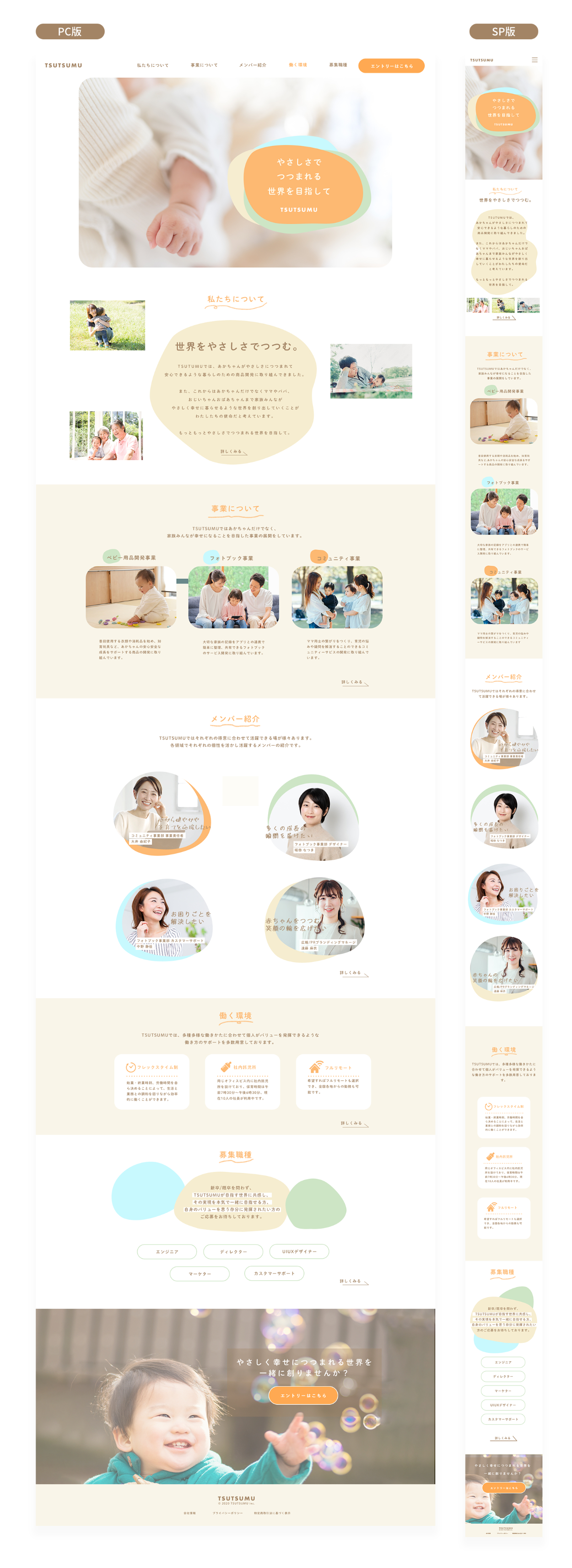 SHElikes MULTI CREATOR PROJECT にてベビー用品をメインとする企業の採用ページのデザインから実装を行いました。|PC /SPデザインカンプ、 ワイヤーフレーム 、コーディング[制作時間:120H / 使用ツール:Photoshop/VS Code]