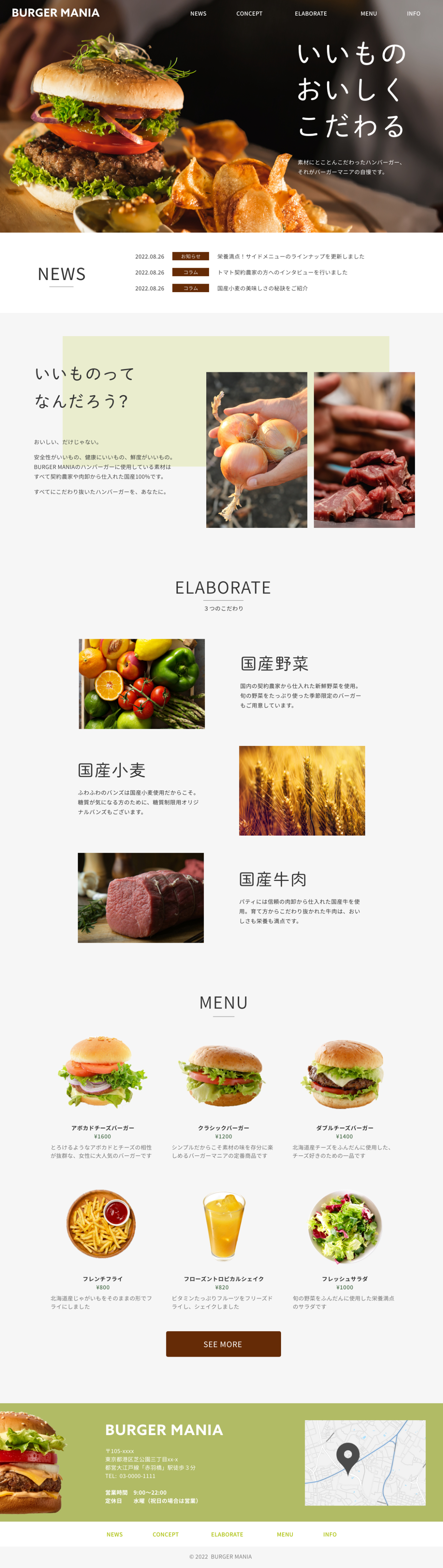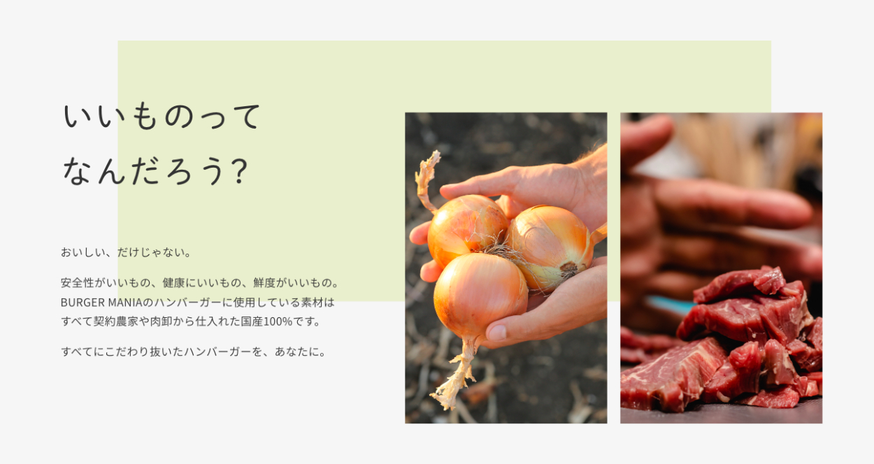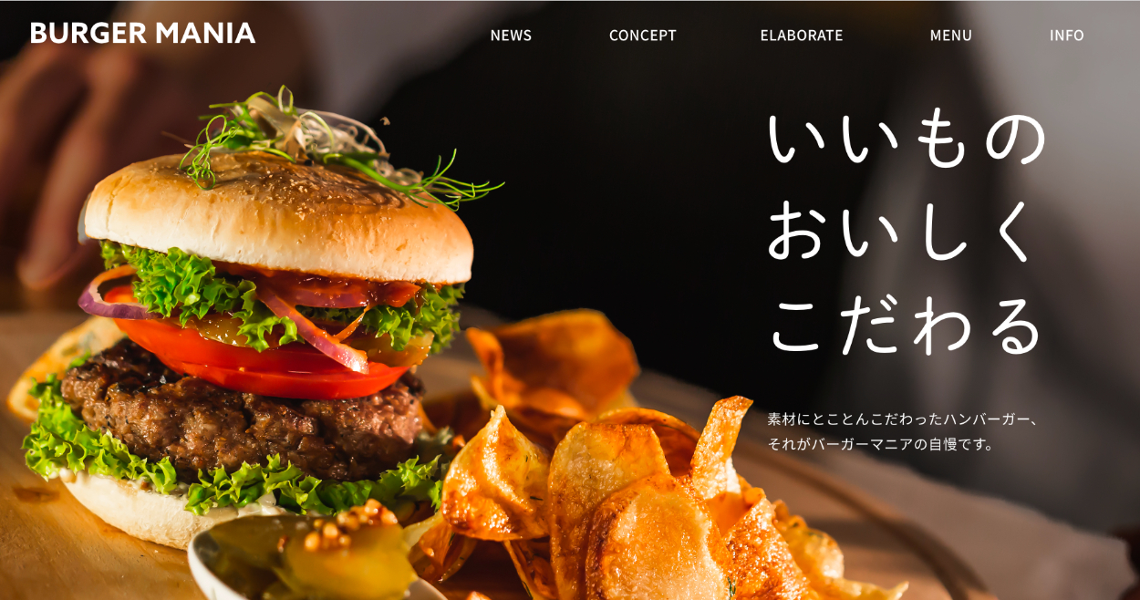 国産野菜、国産牛肉100%の安心で新鮮なハンバーガーショップ「Burgermania」のウェブサイトの製作依頼。