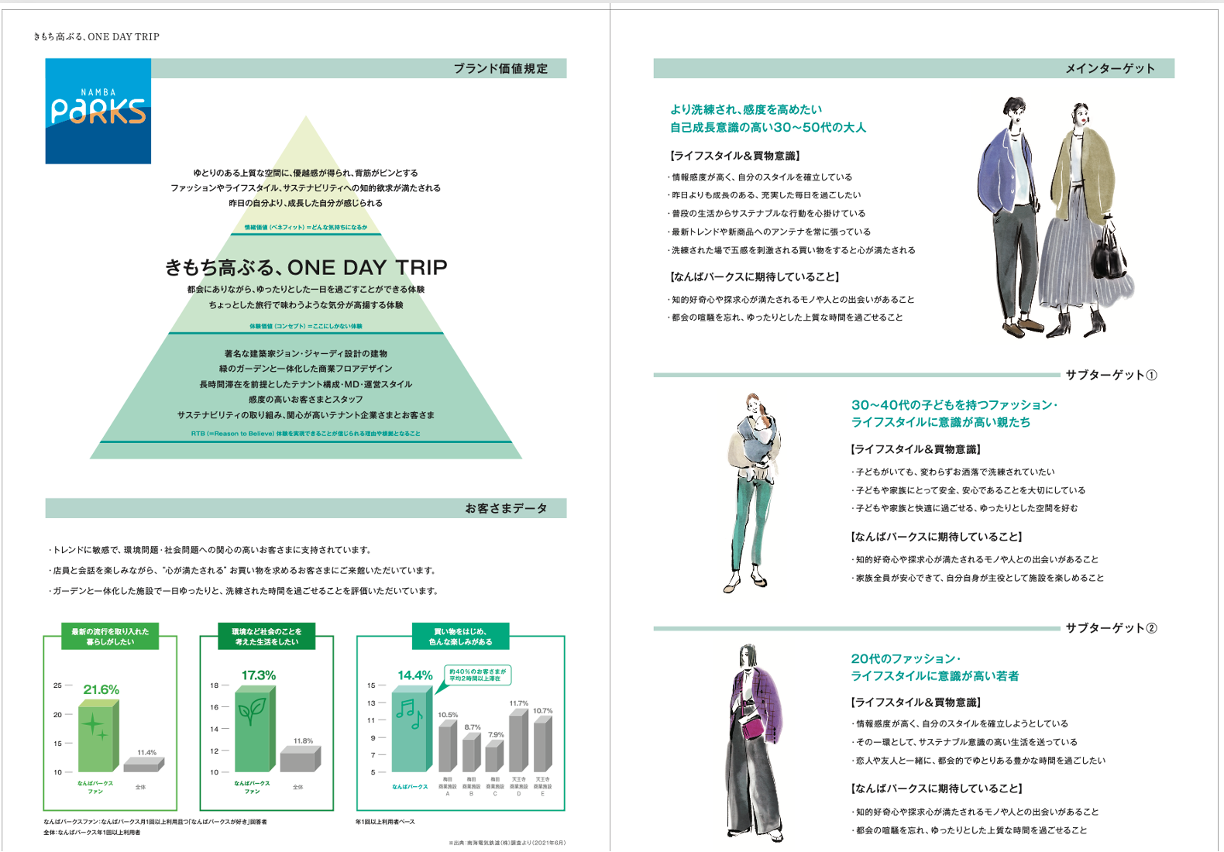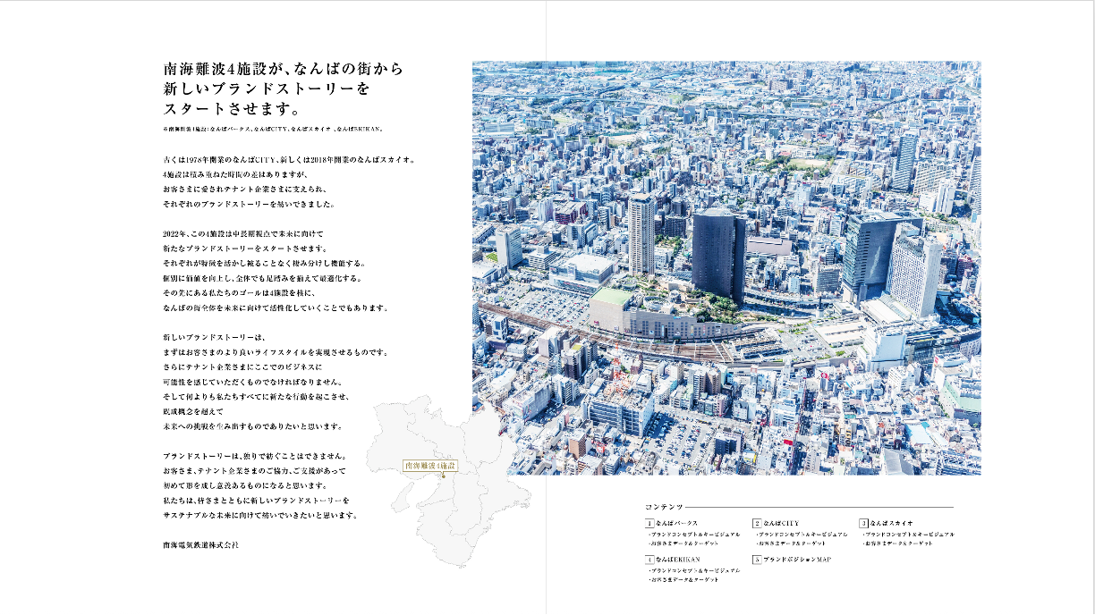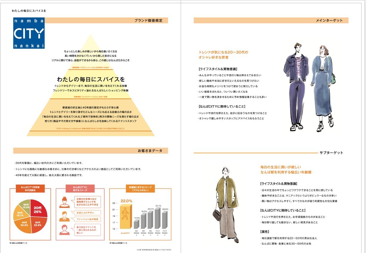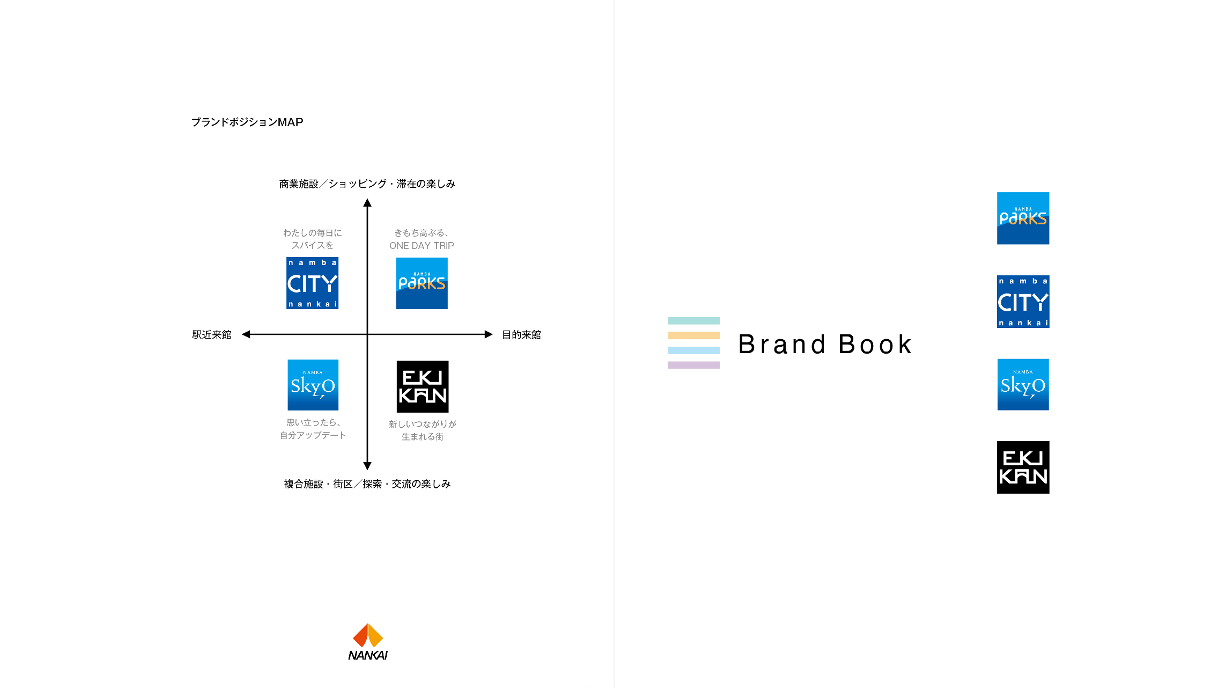 「なんばパークス」「なんばCITY」「なんばスカイオ」「なんばEKIKAN」の4施設に対しての買物実態調査・ワークショップを実施し、得意先と共になんばエリアの中核となる4施設の中長期ブランド戦略を策定。ブランディング活動を開始するにあたってのブランドブックを作成した。
