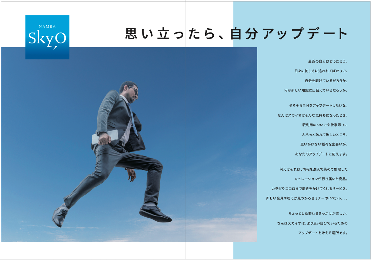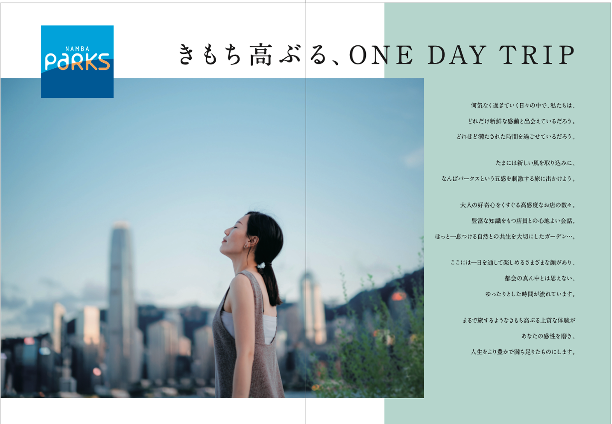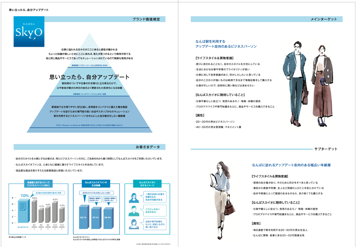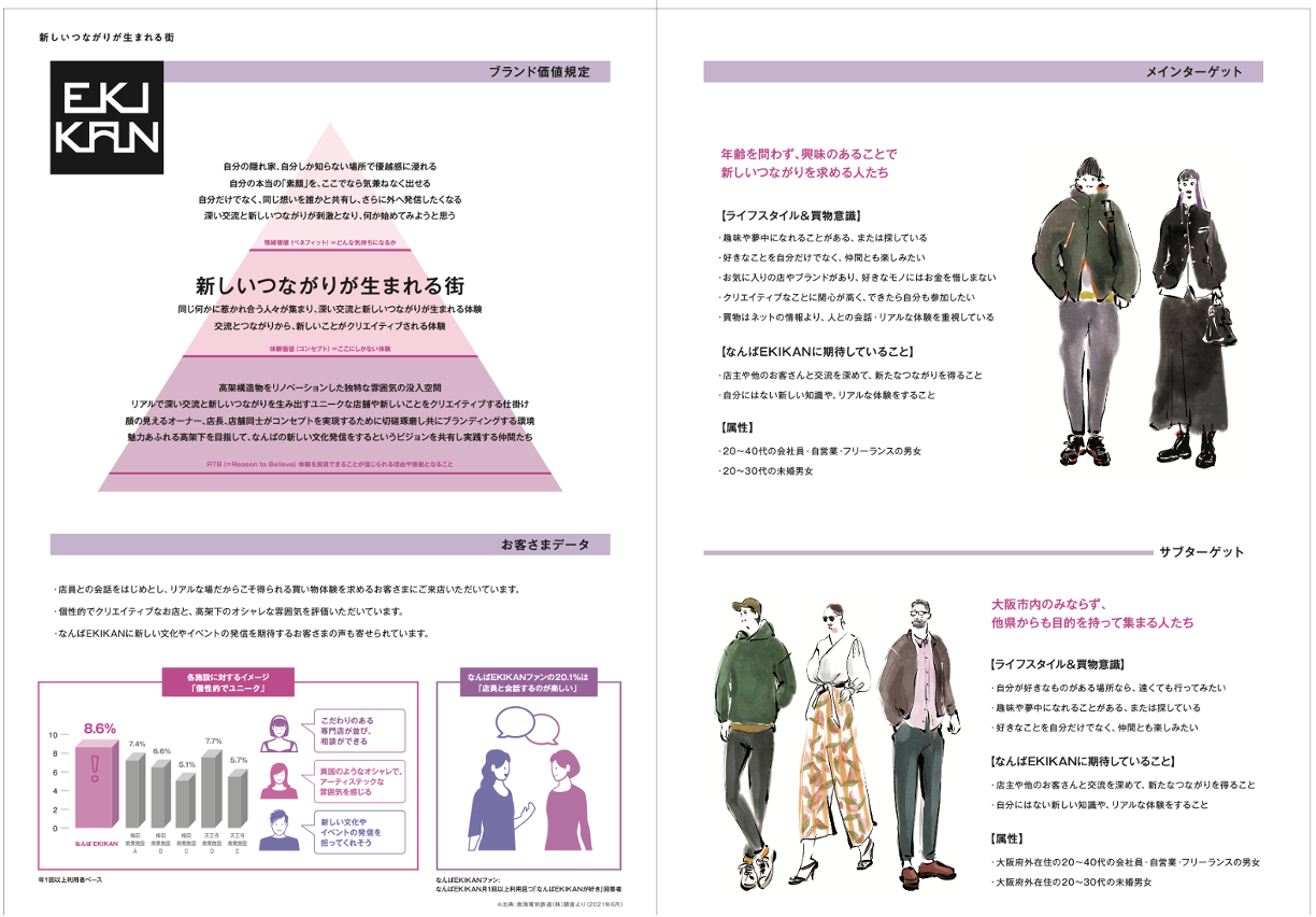 「なんばパークス」「なんばCITY」「なんばスカイオ」「なんばEKIKAN」の4施設に対しての買物実態調査・ワークショップを実施し、得意先と共になんばエリアの中核となる4施設の中長期ブランド戦略を策定。ブランディング活動を開始するにあたってのブランドブックを作成した。